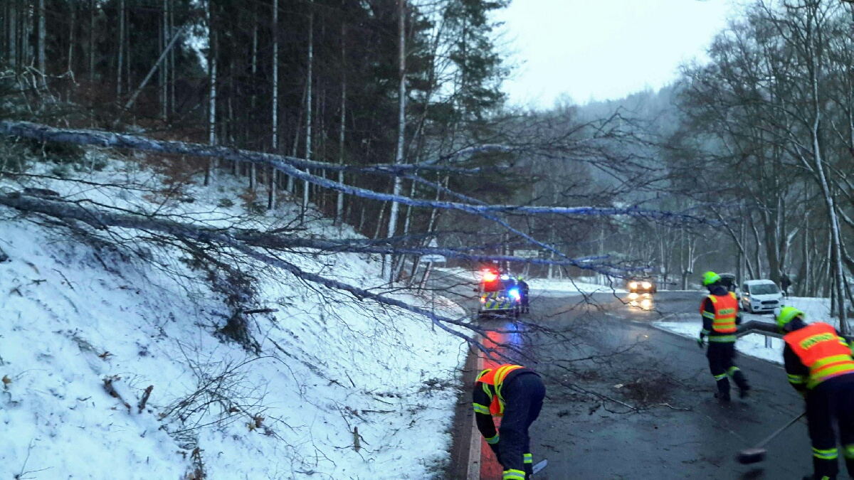 Po silném větru a v kombinaci s čerstvým sněžením zasahovali hasiči u téměř pěti desítek událostí. Od pátečního dopoledne do sobotního odpoledne vyjížděli ve 37 případech odstranit popadané stromy na silnice po celém kraji.