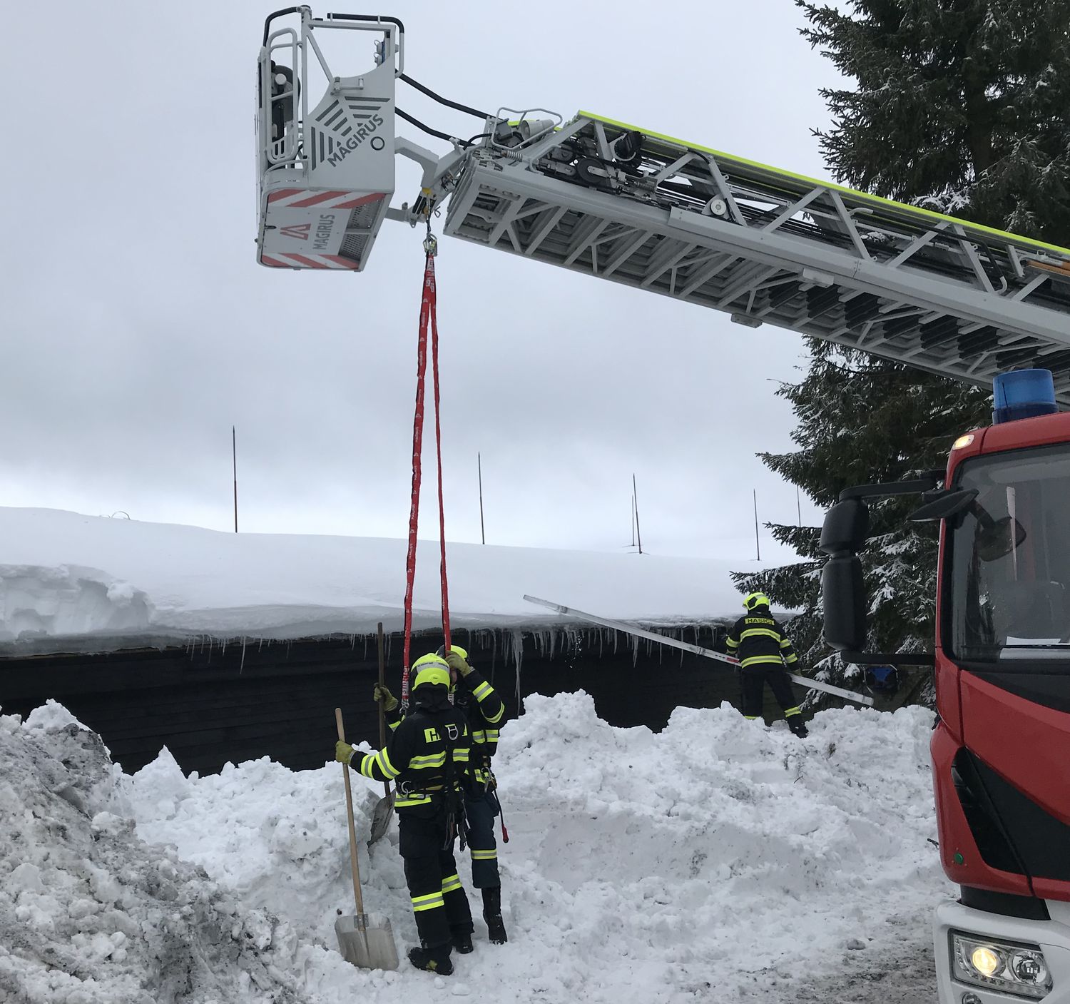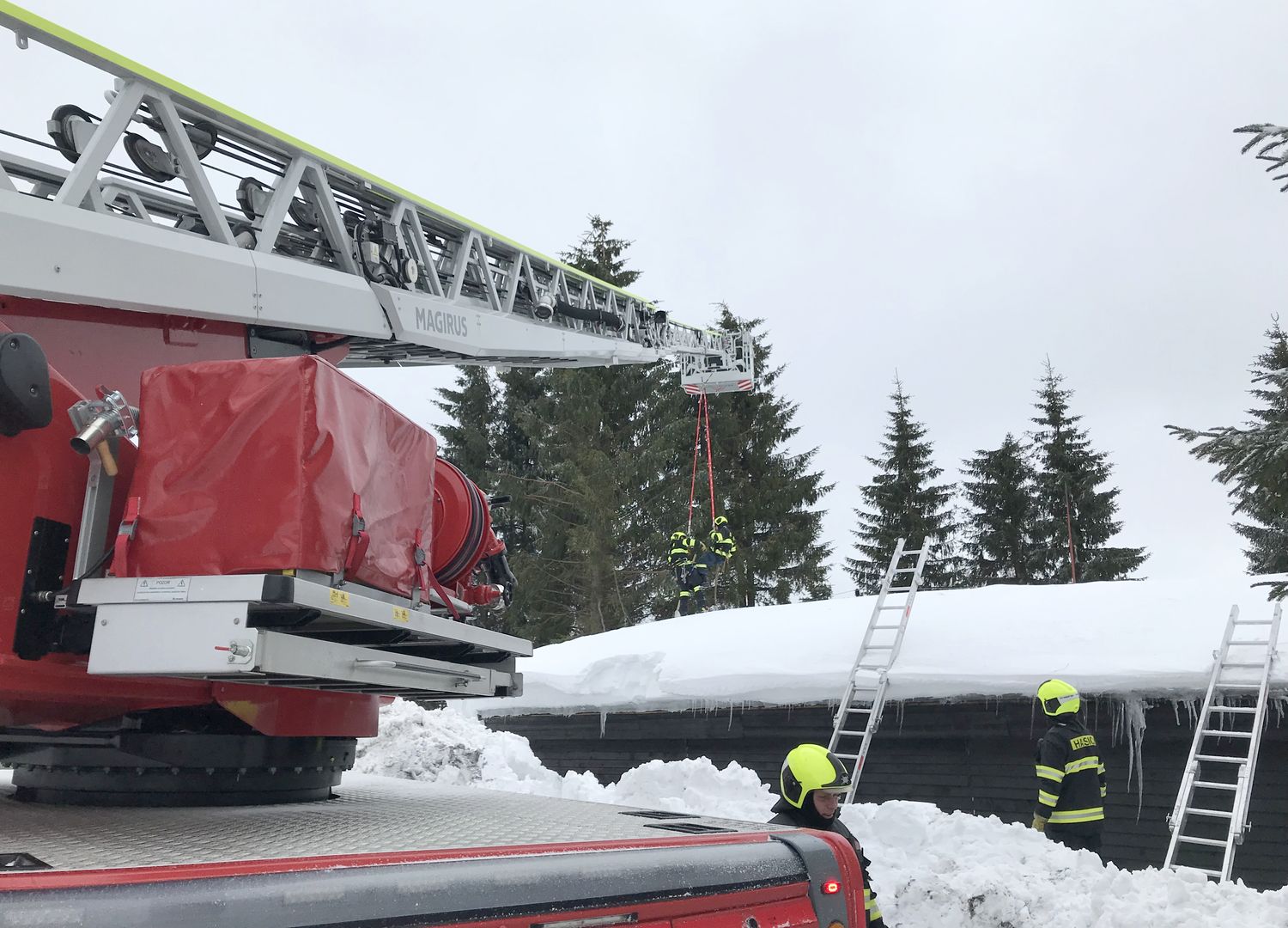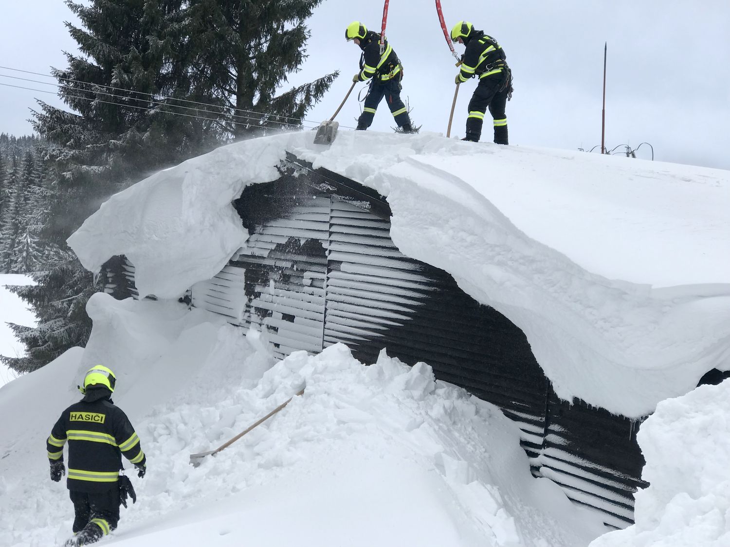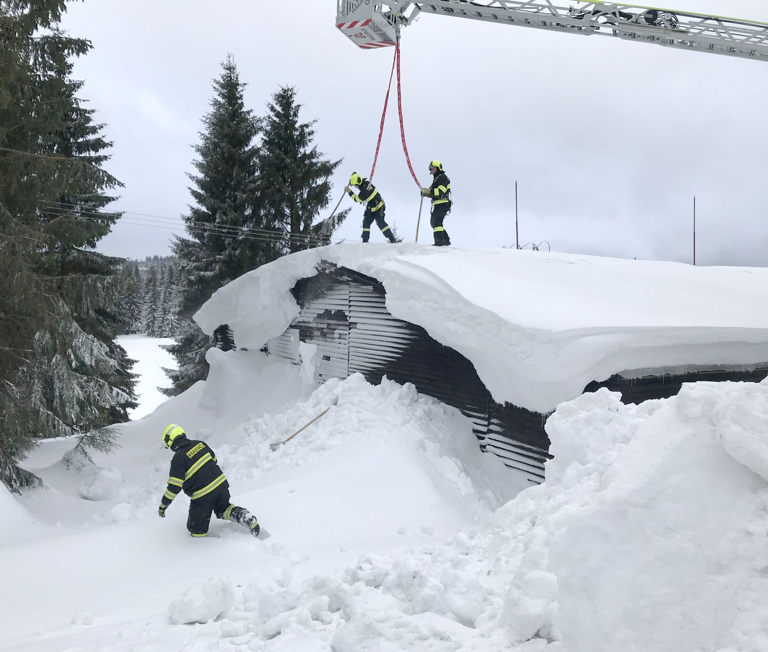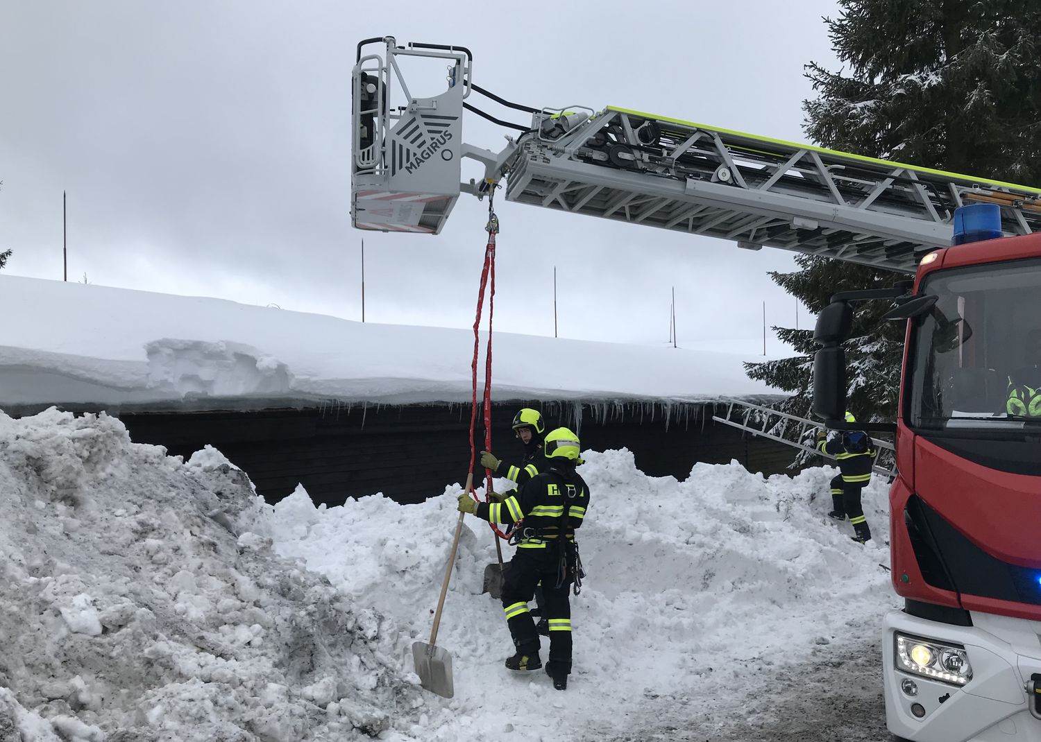 Na střeše budovy ležela místy až dva metry vysoká vrstva těžkého sněhu, uvnitř objektu došlo již k částečnému propadu stropu. Přivolaní hasiči se pokusili odlehčit střešní konstrukci tím, že začali odhazovat sníh ze střechy. Kvůli bezpečí zasahujících hasičů byli jištěni z vysunutého automobilového žebříku.