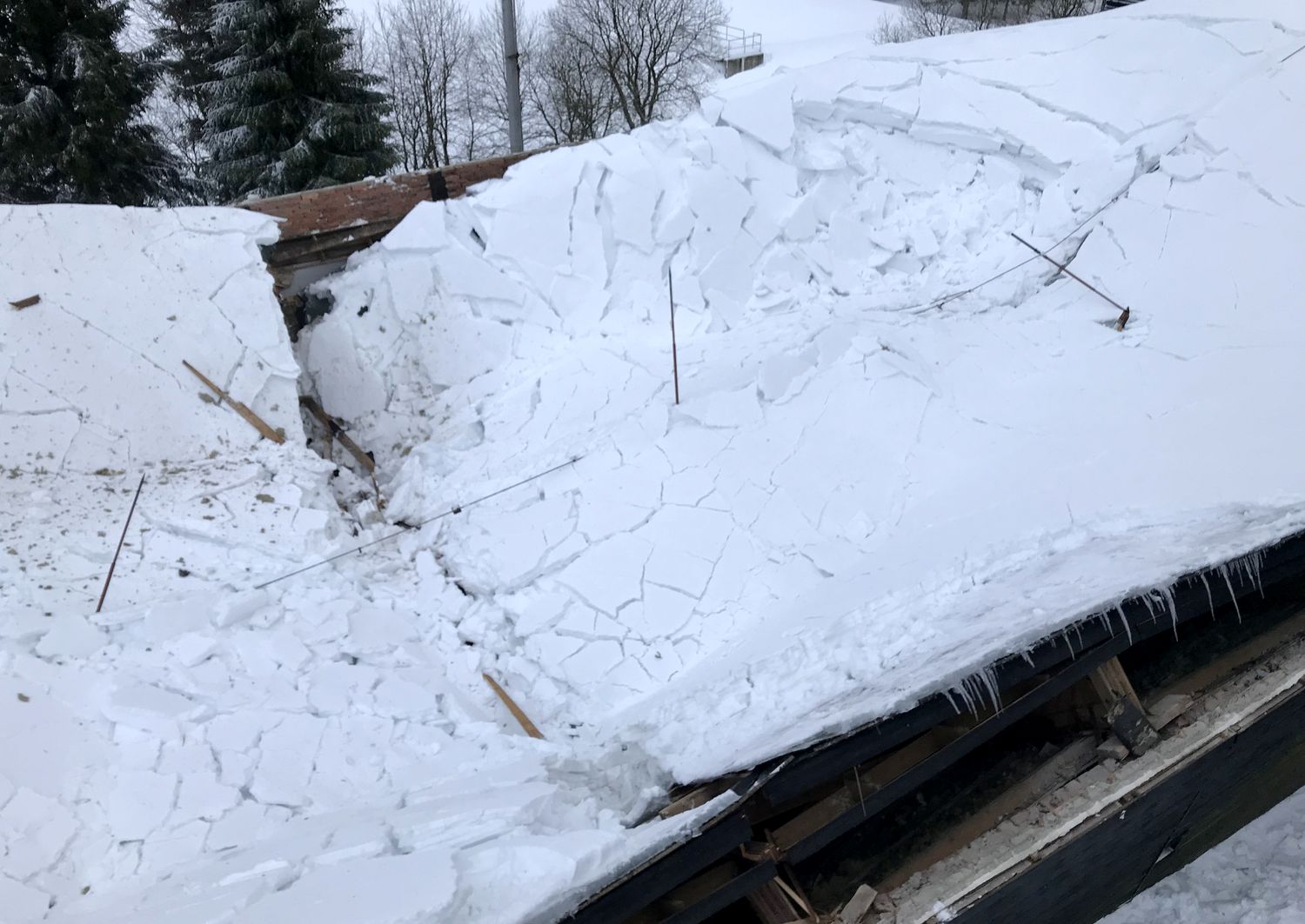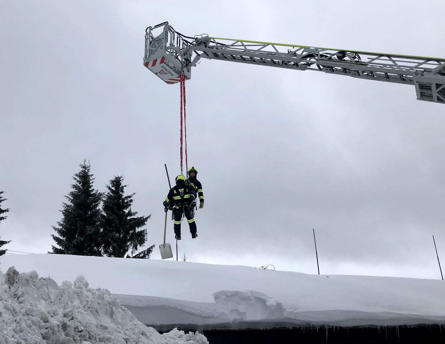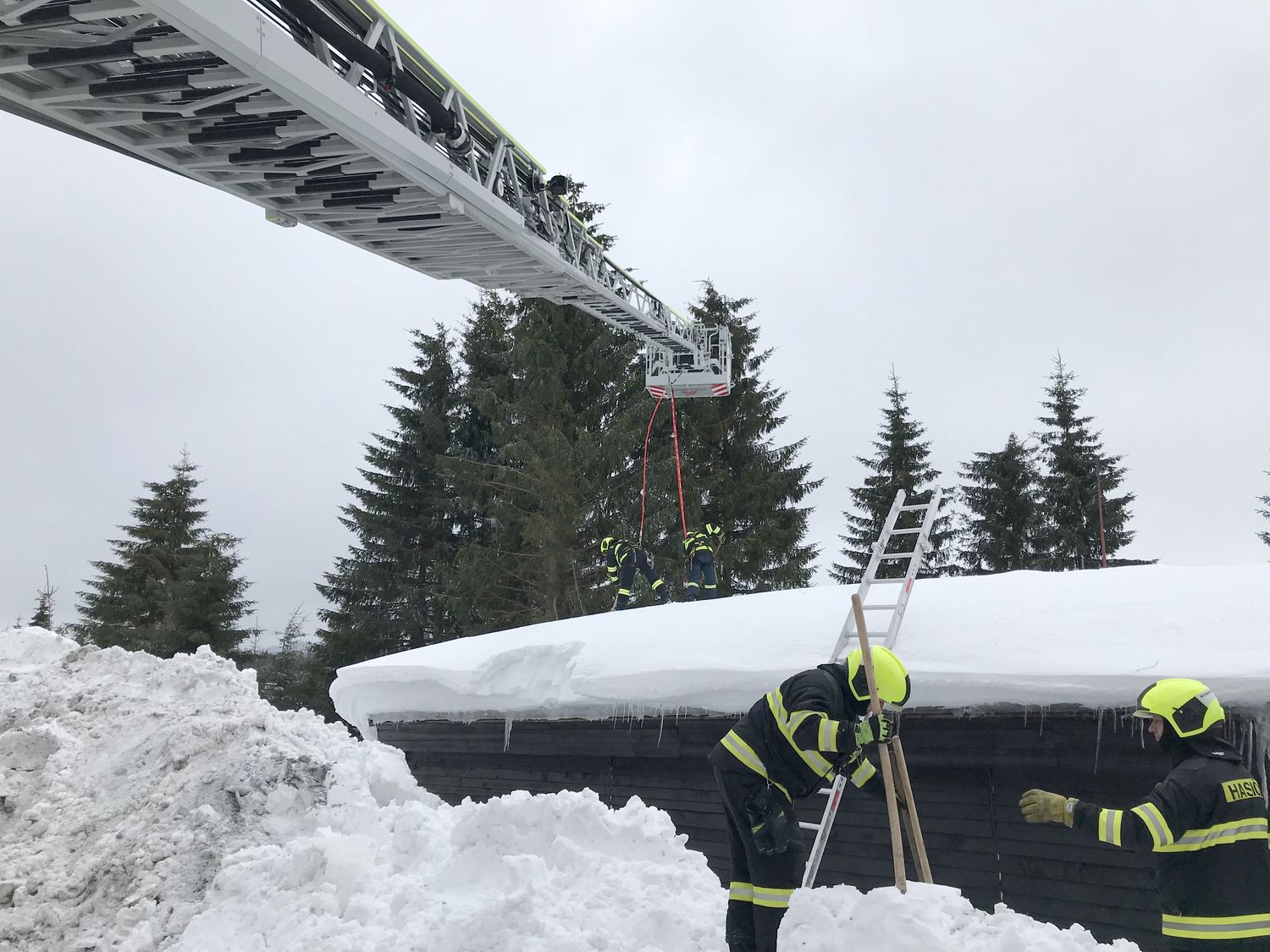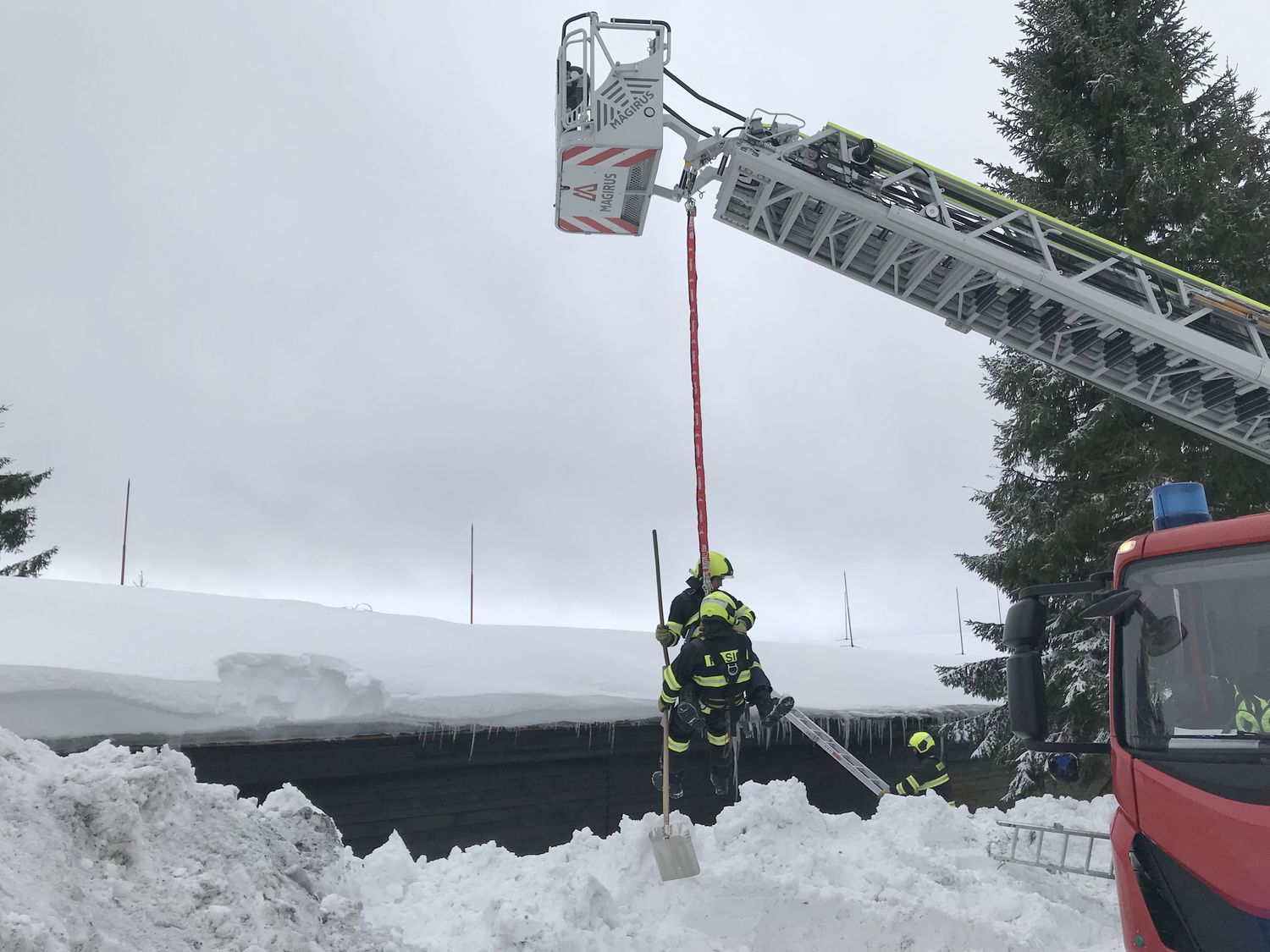 Na střeše budovy ležela místy až dva metry vysoká vrstva těžkého sněhu, uvnitř objektu došlo již k částečnému propadu stropu. Přivolaní hasiči se pokusili odlehčit střešní konstrukci tím, že začali odhazovat sníh ze střechy. Kvůli bezpečí zasahujících hasičů byli jištěni z vysunutého automobilového žebříku.