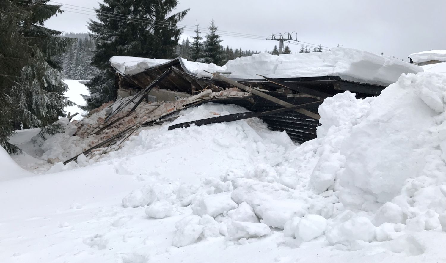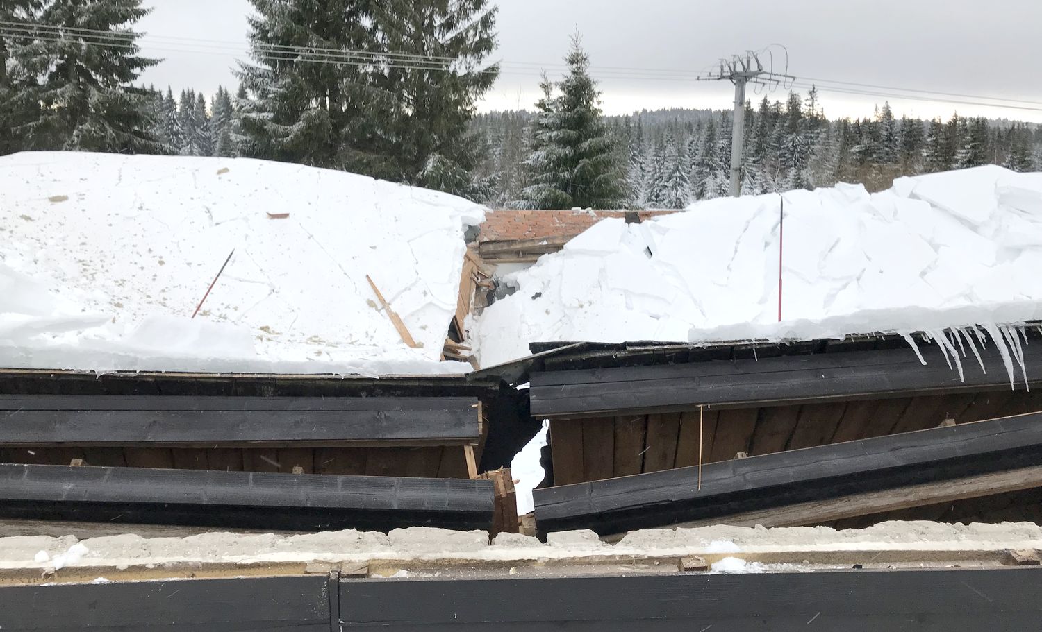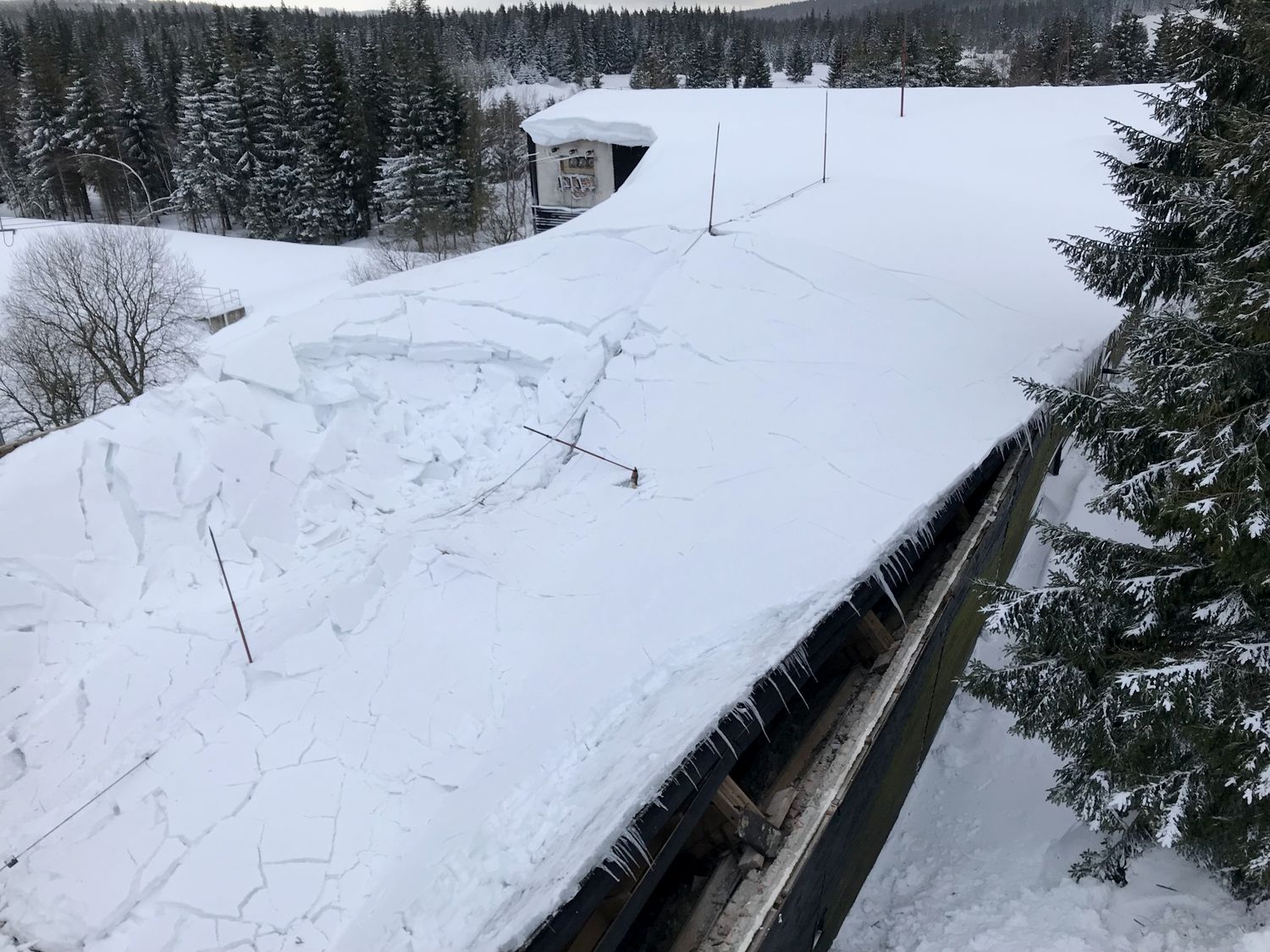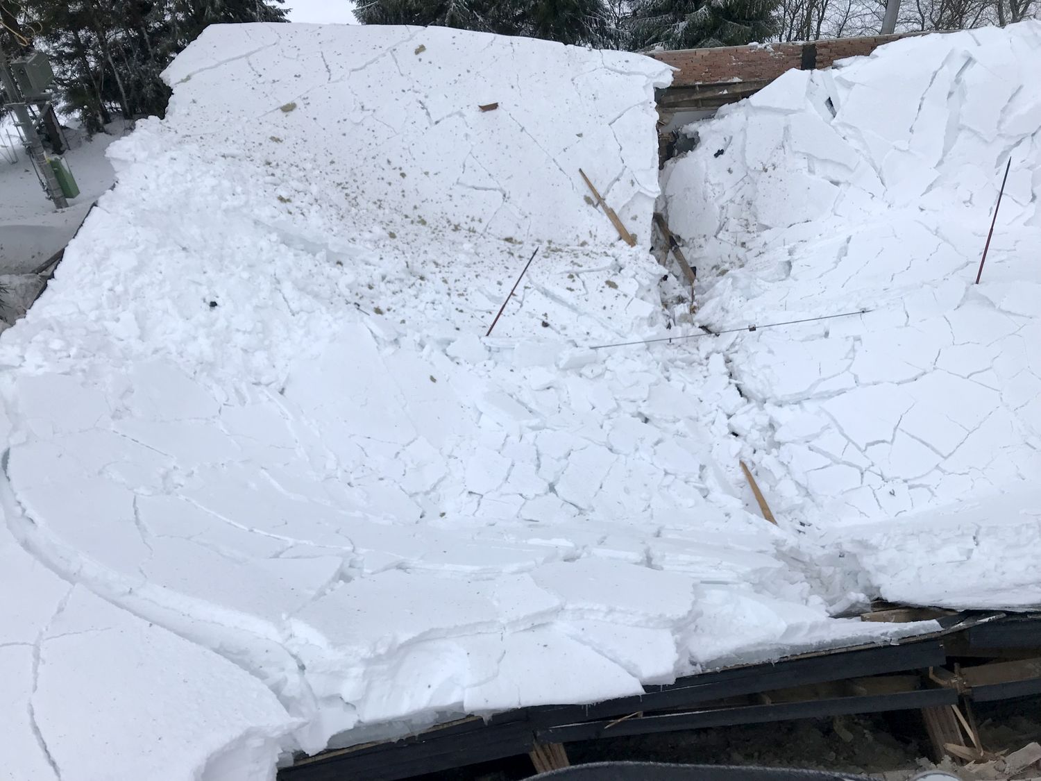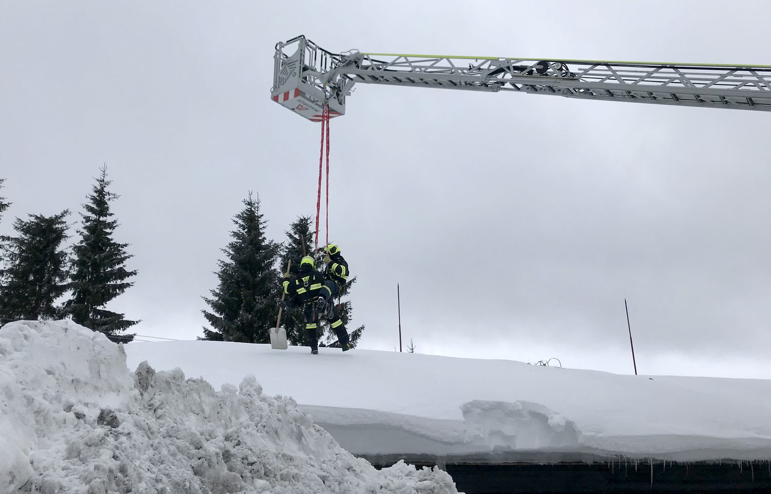 Na střeše budovy ležela místy až dva metry vysoká vrstva těžkého sněhu, uvnitř objektu došlo již k částečnému propadu stropu. Přivolaní hasiči se pokusili odlehčit střešní konstrukci tím, že začali odhazovat sníh ze střechy. Kvůli bezpečí zasahujících hasičů byli jištěni z vysunutého automobilového žebříku.