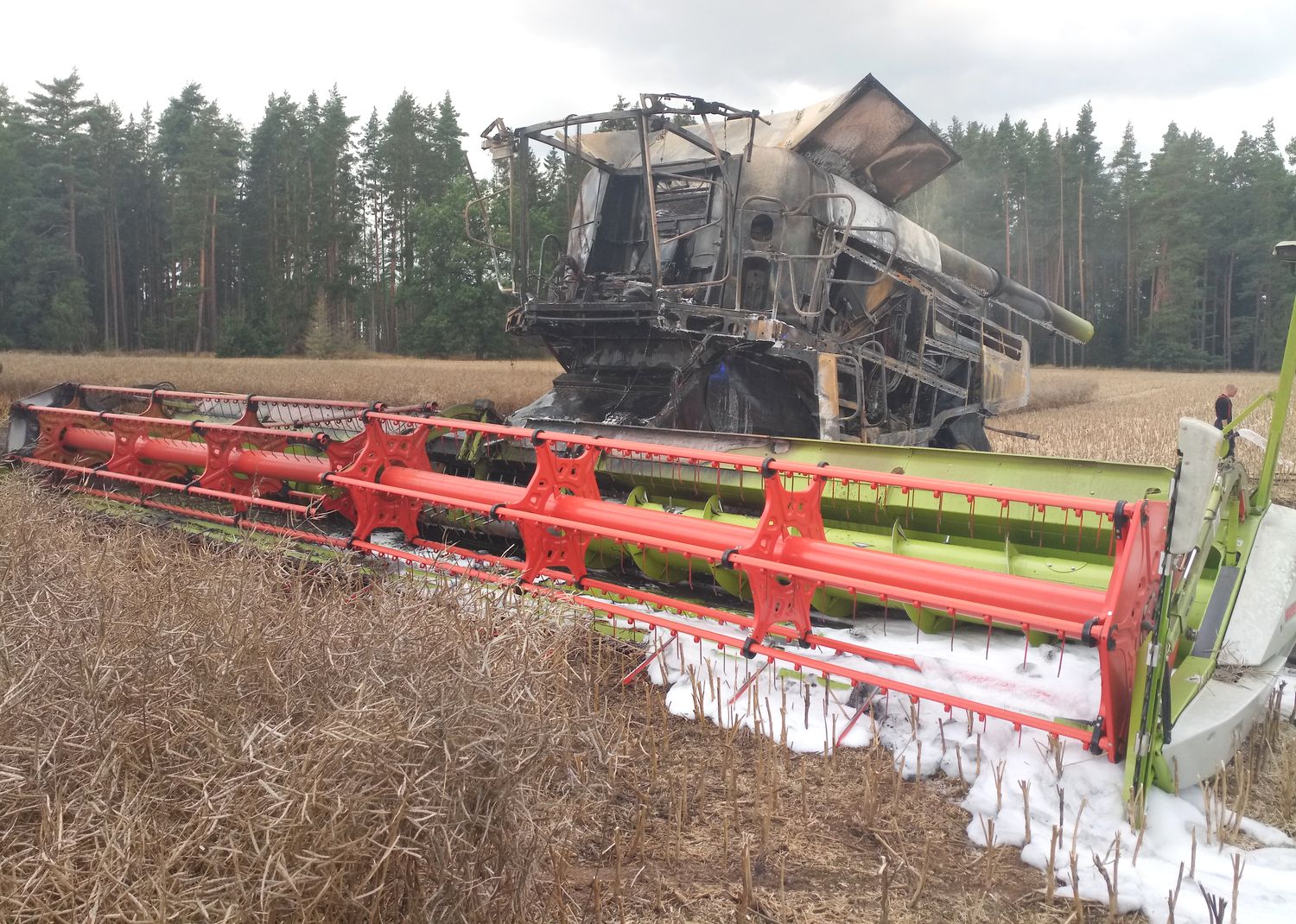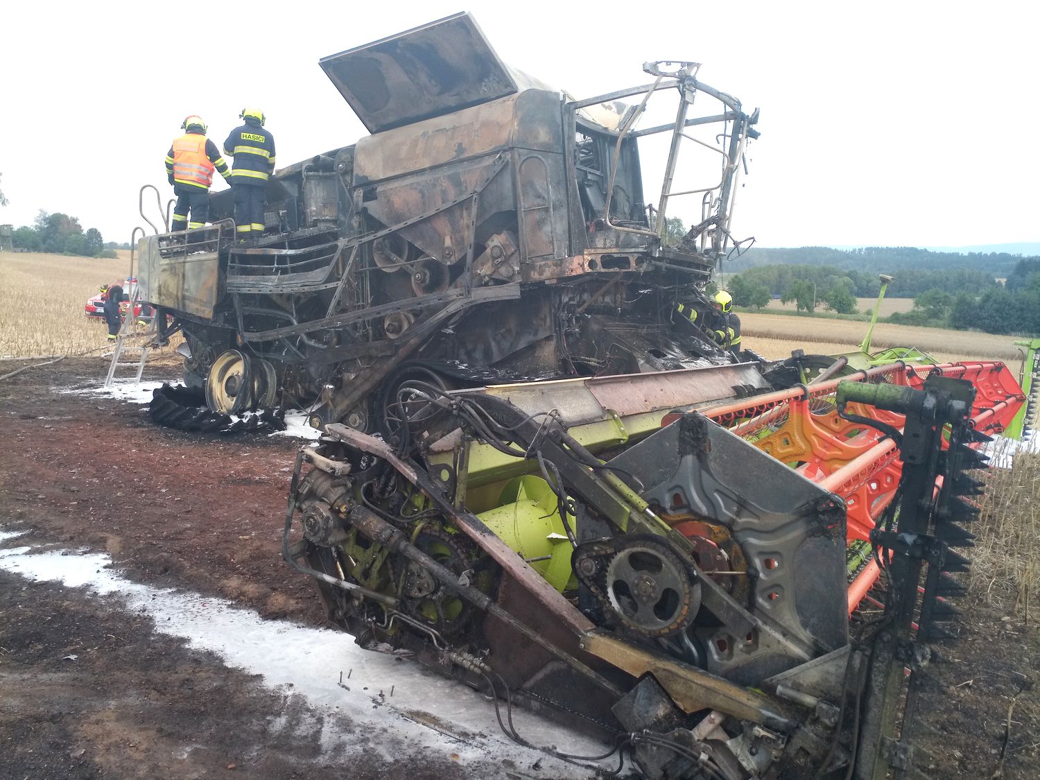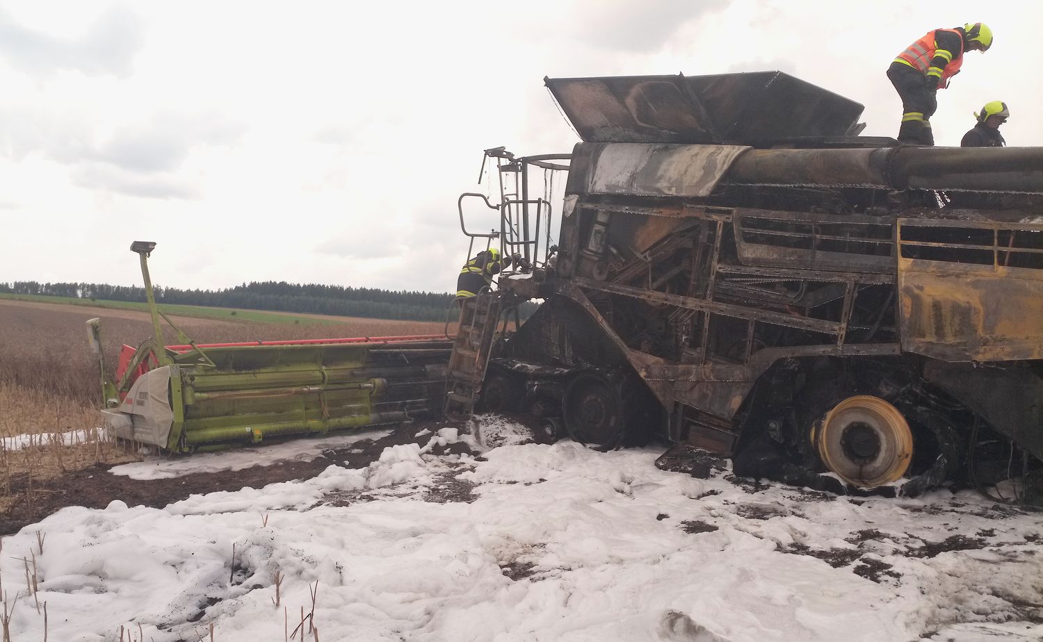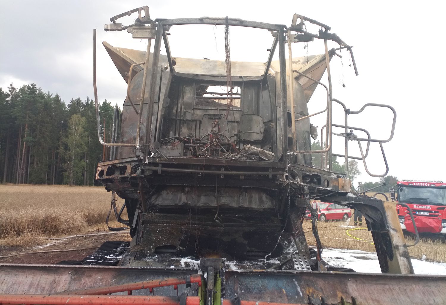 U požáru zasahovaly čtyři jednotky hasičů, oheň zemědělský stroj zcela zničil. Oheň zasáhl rovněž pole, rozšířil se ale jen v těsné...