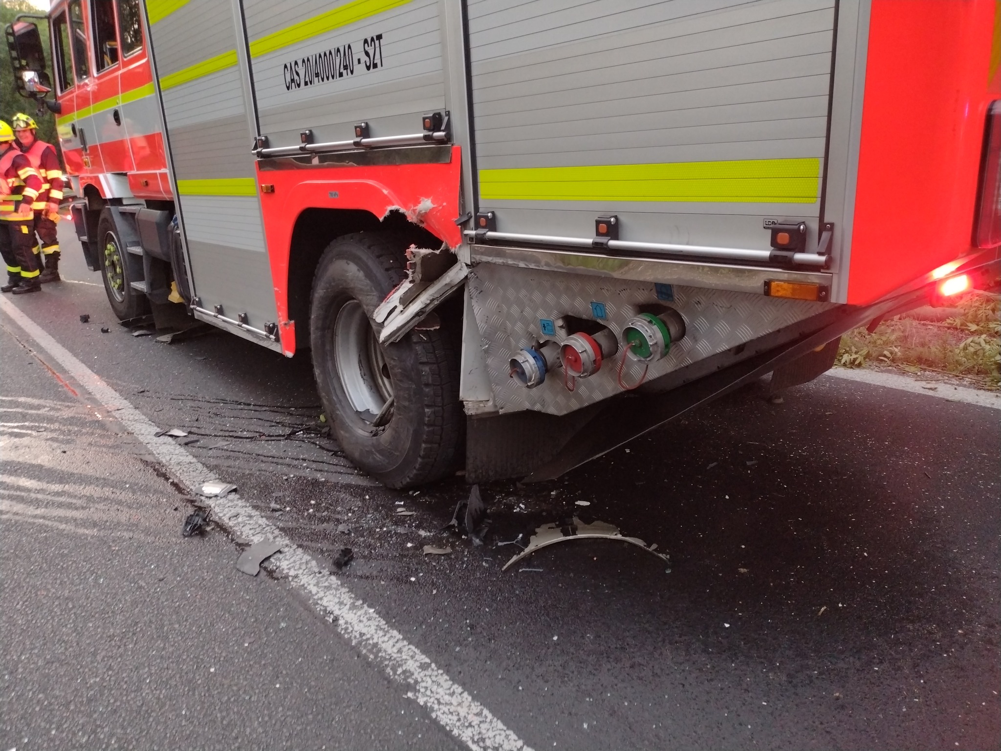 Při srážce s hasičkou cisternou narazilo osobní auto také do jednoho zasahujícího hasiče. Další hasič pak stihl na poslední chvíli...