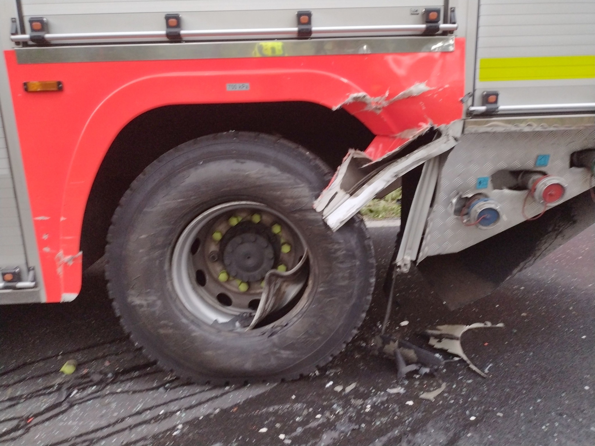 V jednu chvíli pak zpoza kolony přijelo osobní vozidlo, které zezadu narazilo do zásahové cisterny hasičů ze stanice Ostrov a následně narazilo ještě do vozidla policie. Jak naše cisterna, tak policejní vůz měl zapnuté majáky.