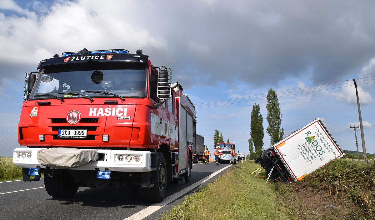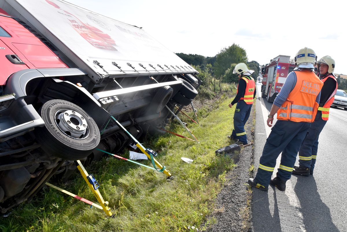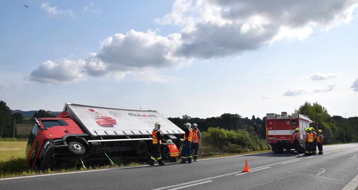 Nákladní auto sjelo na silnici z Karlových Varů na Prahu do příkopu