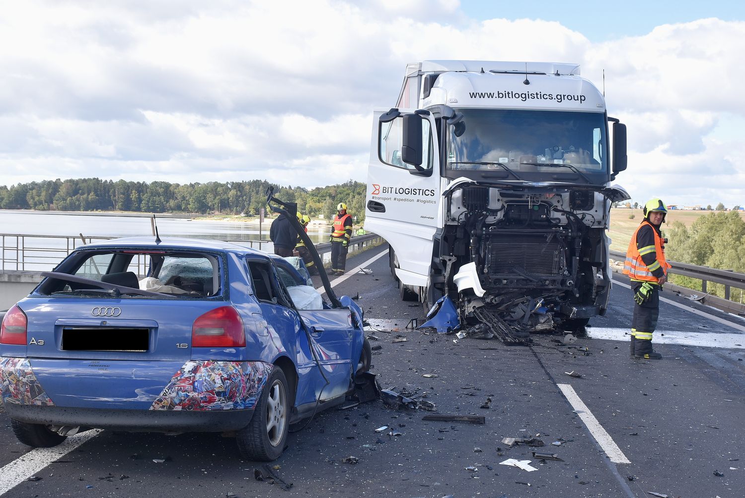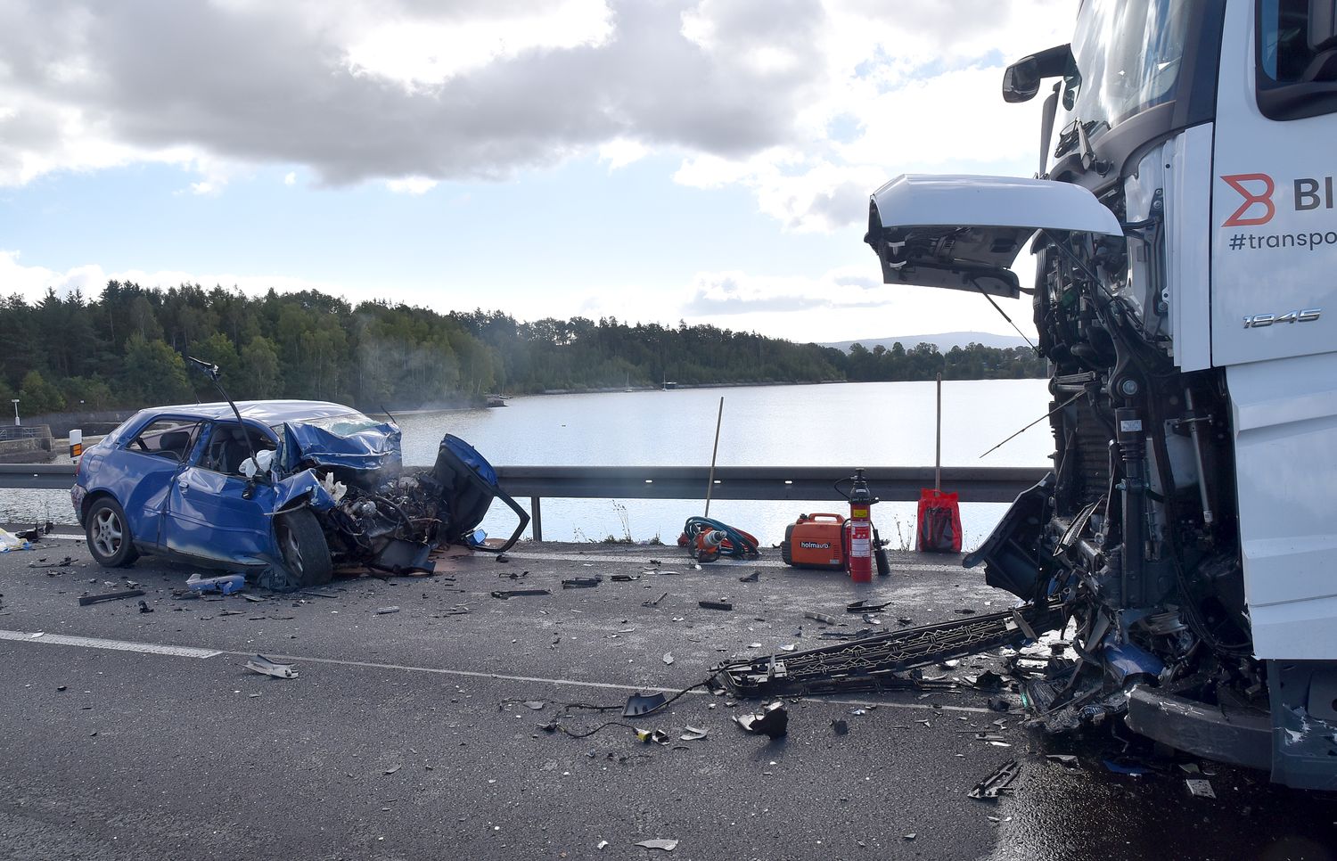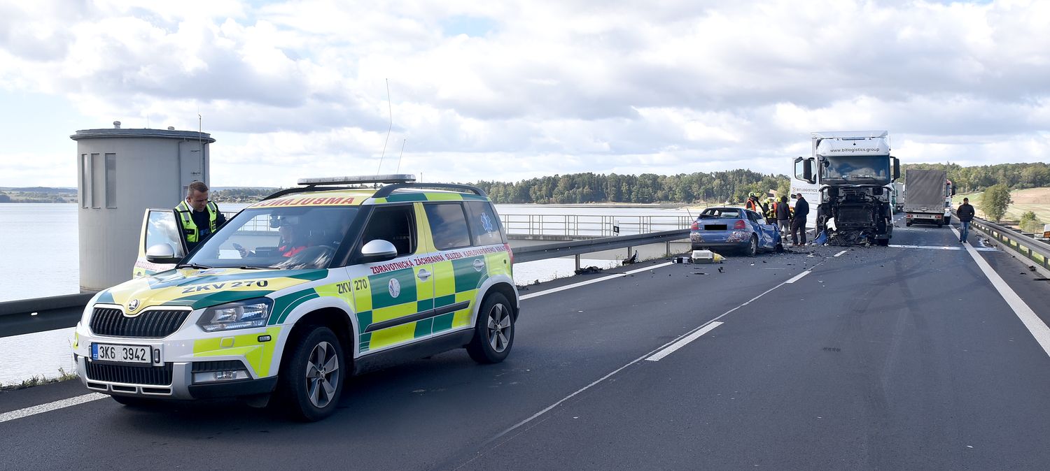 Na hrázi jesenické přehrady čelně narazilo osobné auto do protijedoucího kamionu. V osobním autě jela jedna osoba, ta po nárazu zůstala zaklíněná ve zdemolovaném voze.