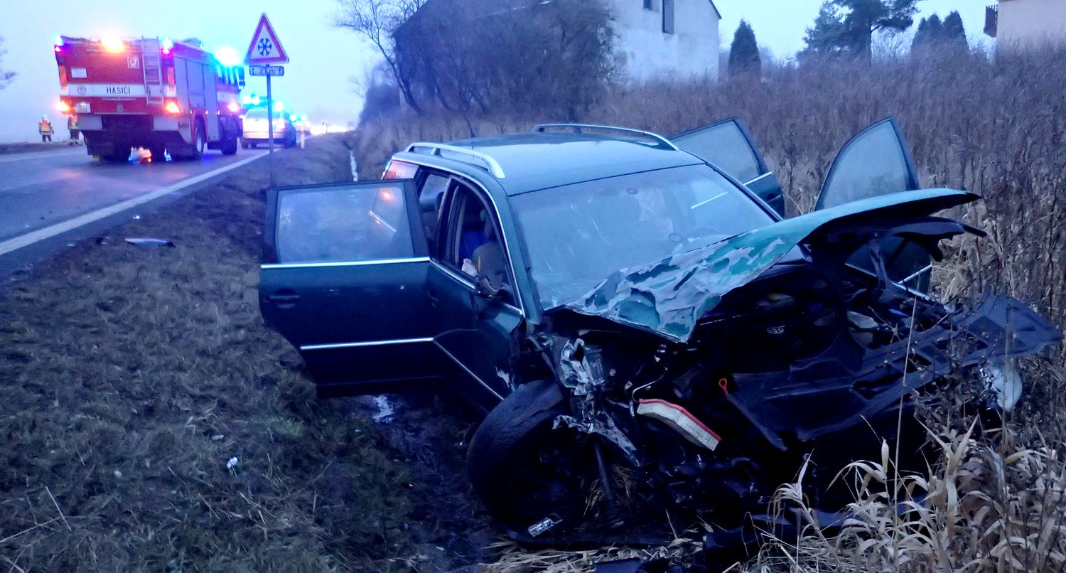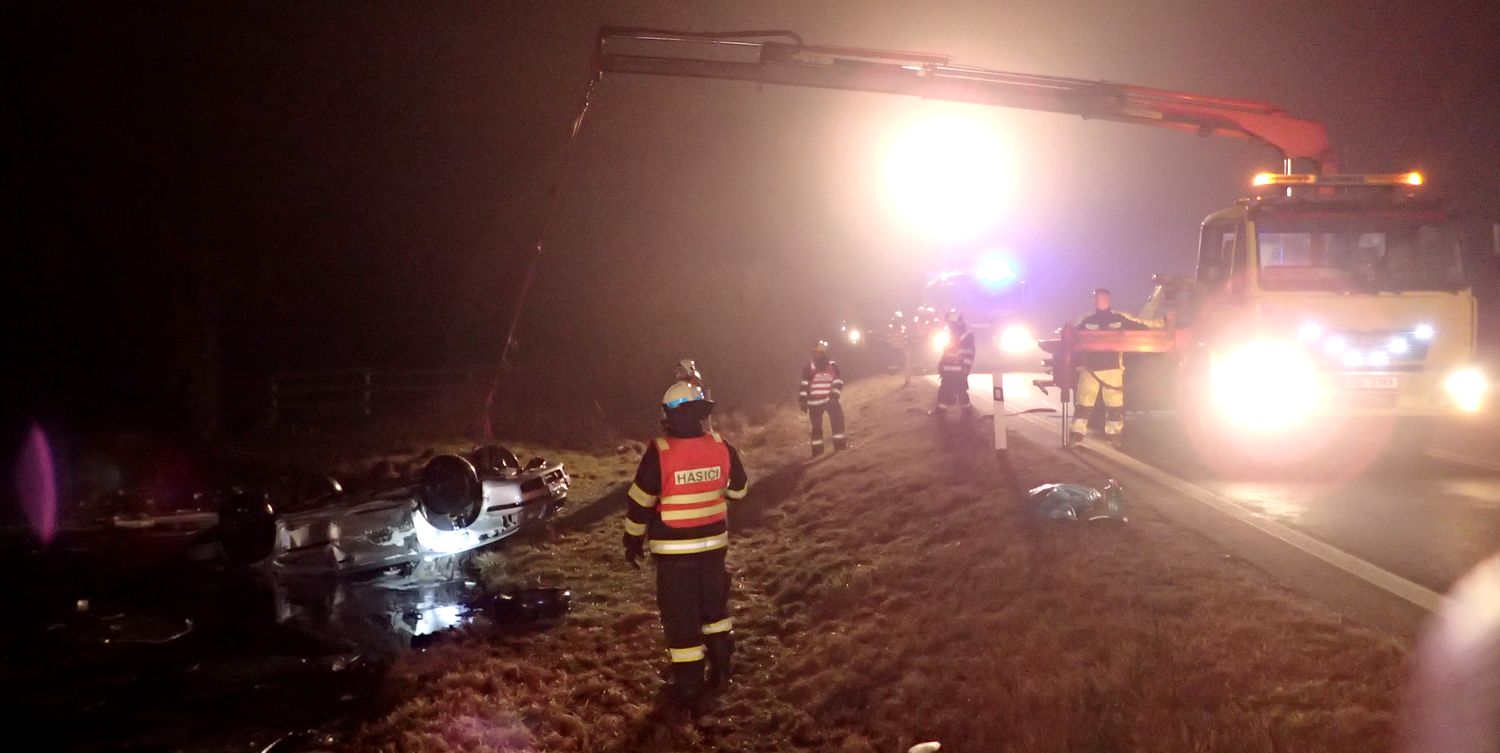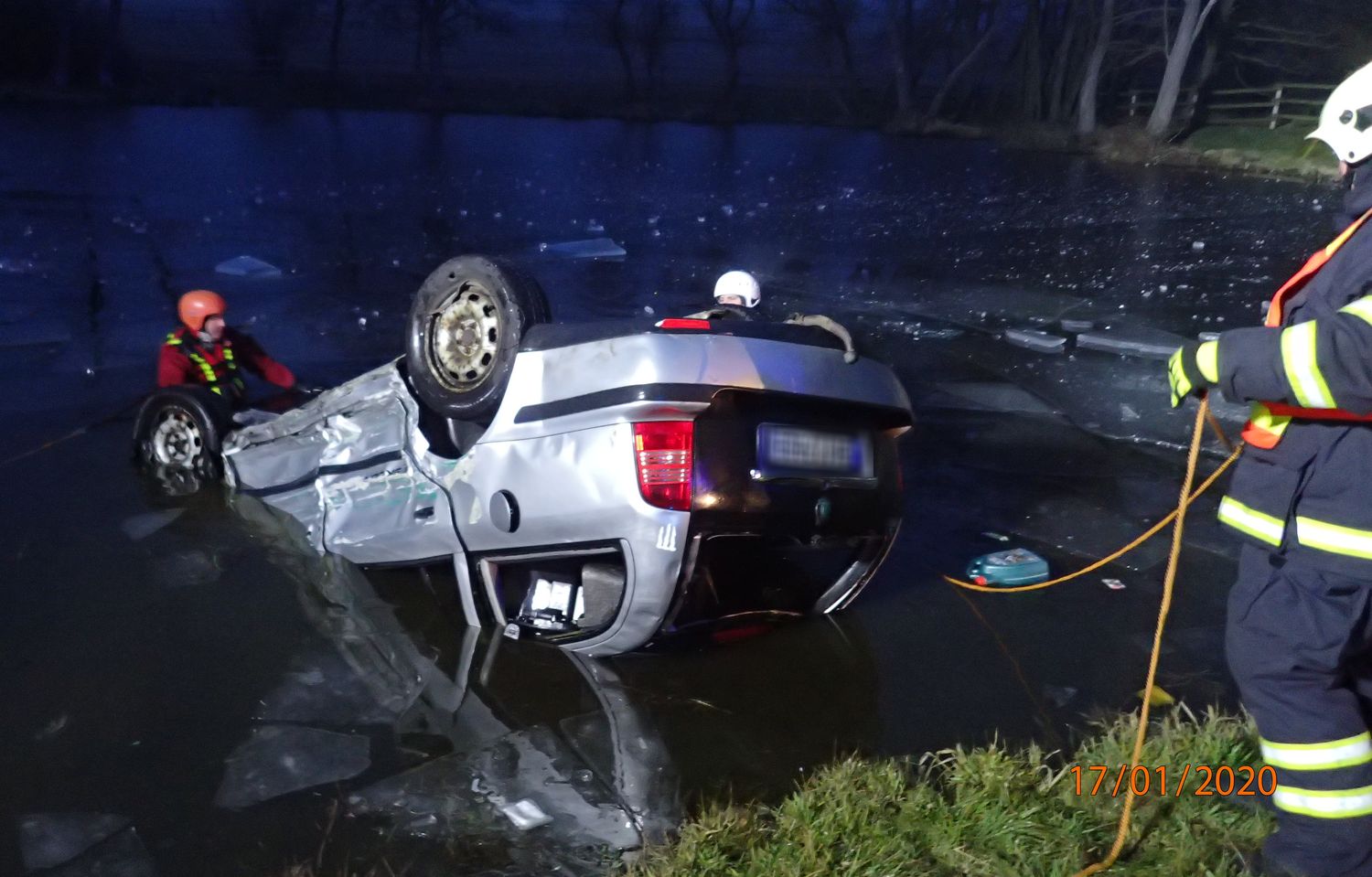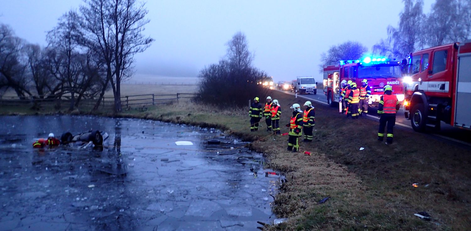 Dvě osobní auta havarovala v pátek odpoledne na silnici I/6 za Bochovem ve směru na Prahu u obce Herstošice. Jedno z vozidel se po nehodě převrátilo na střechu a spadlo do zamrzlého rybníku vedle silnice. V autě byly v momentě nehody čtyři dospělé osoby. Ihned po převrácení auta do vody skočili dva svědci nehody do rybníku a z potápějícího se auta dokázali vytáhnout všechny čtyři cestující. Ve druhém havarovaném vozidle byly zraněné tři osoby, dvě dospělé a jedno dítě. Na místo byly vyslány čtyři jednotky hasičů, první hasiči byli na místě události za deset minut od nahlášení. O zraněné se postarala záchranná služba, hasiči zajistili havarovaná vozidla, v ochranných oblecích do vody se dostali k převrácenému autu, kde se snažili zachránit psa, který se měl ve vozidle nacházet. Zvířeti už ale nemohli pomoct. Kvůli hrozbě úniku provozních kapalin do vody přitáhli hasiči navijákem auto ke břehu, ven z rybníku pak auto vyprostila odtahová služba. Po celou dobu zásahu byl provoz na silnici zcela zastavený.