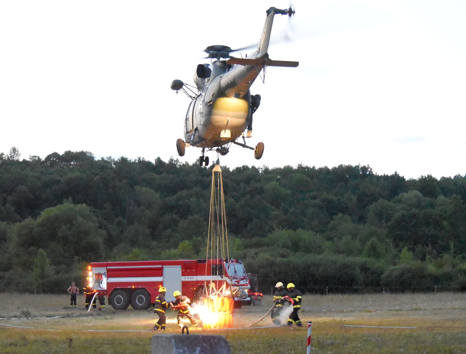 Po střelbách ve vojenském prostoru Hradiště začala ve středu odpoledne v dopadové ploše hořet tráva a náletové dřeviny. Kvůli velkému riziku přítomnosti nevybuchlé munice v místě požáru nebylo bezpečné vstupovat do prostoru požářiště, bylo tak potřeba povolat letecké hašení. Zásah si od vojenských hasičů převzali karlovarští hasiči, velitel zásahu vyhlásil III. stupeň požárního poplachu, kromě armádního vrtulníku s bambivakem na místě zasahovalo desek jednotek hasičů z Karlovarského a Ústeckého kraje. Samotné hašení probíhalo z vrtulníku a částečně ze zpevněných cest podél místa požáru, do samotného prostoru dopadové plochy vojenské střelnice měli hasiči po celou dobu z důvodu bezpečnosti zakázaný vstup. Po deváté hodině večer bylo šíření požáru zastaveno, přes noc bylo potřeba požářiště hlídat, kontroly ze strany vojenských hasičů zde budou probíhat i následující dny.