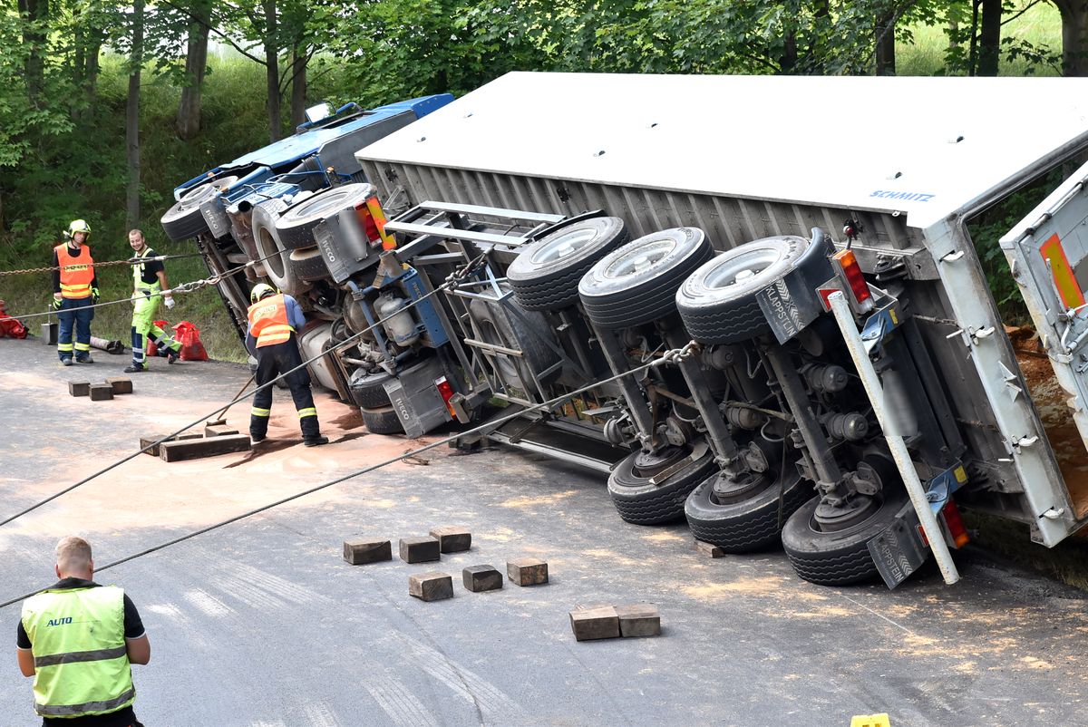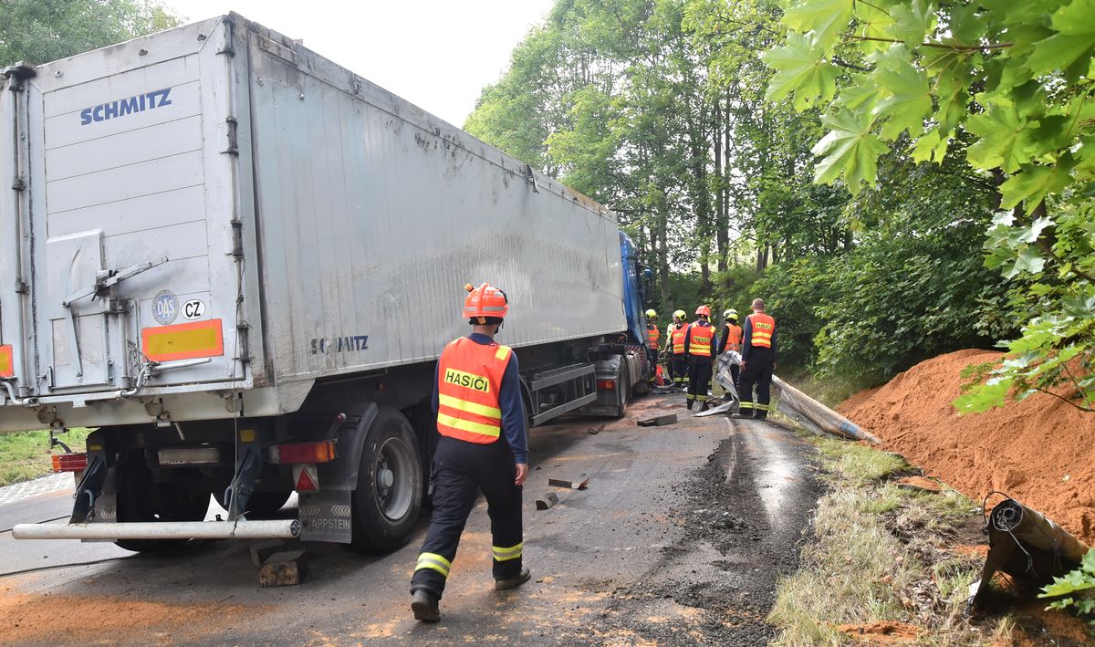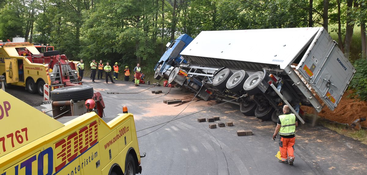 Kamion převážející písek se převrátil v pondělí před poledne na silnici z Krásna na Sokolovsku směrem na Plzeň. Nákladní auto...