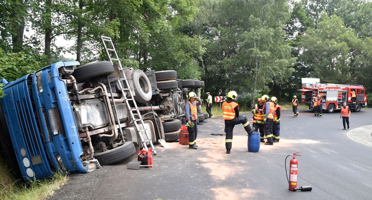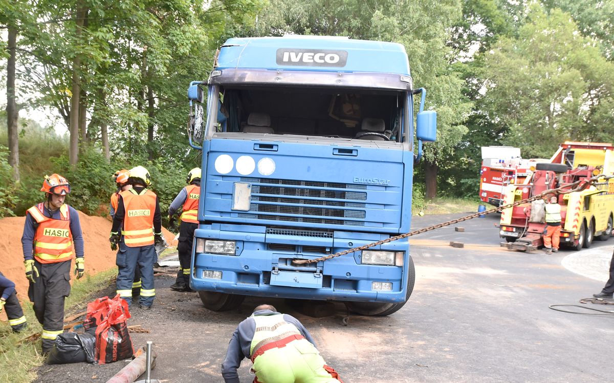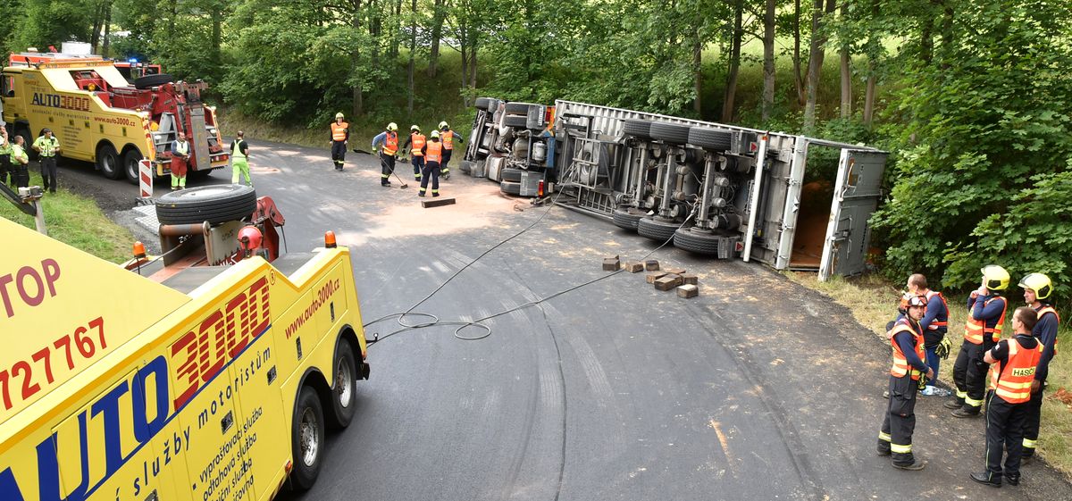 Kamion převážející písek se převrátil v pondělí před poledne na silnici z Krásna na Sokolovsku směrem na Plzeň. Nákladní auto zůstalo ležet na krajnici, částečně mimo vozovku. Nehoda se stala v prudké zatáčce. Hasiči tak po příjezdu na místo požádali policii, aby zcela uzavřela v místě nehody provoz. Ten byl obnovený až po více než pěti hodinách. Hasiči se postarali o zraněného řidiče, kterého si převzala záchranná služba. Museli také zamezit úniku provozních kapalin z havarovaného auta. Pro převrácení kamionu zpět na kola přijeli dva vyprošťovací speciály, ještě předtím hasiči ručně vyházeli písek z návěsu, aby auto odlehčili. Po převrácení a naložení na odtahovou službu provedli hasiči závěrečný úklid vozovky, aby mohl být obnovený provoz.