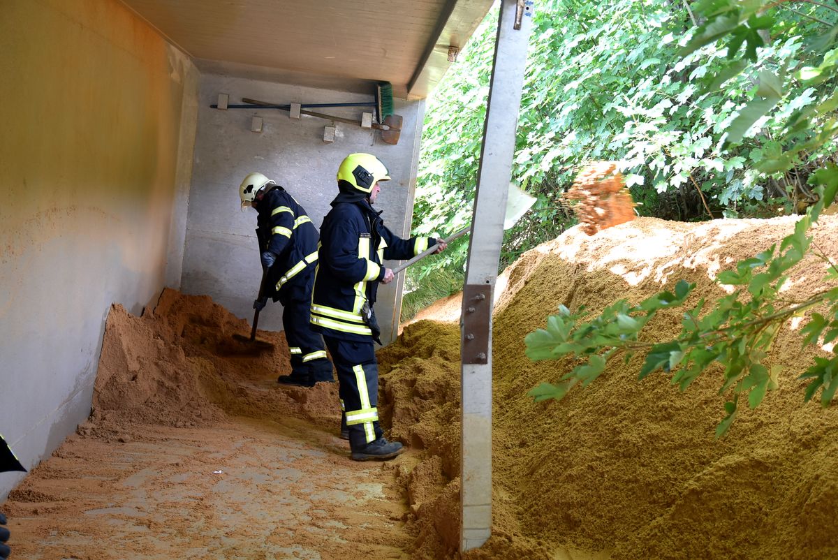 Hasiči museli ručně vyházet náklad písku, poté bylo možné nákladní auto vyprostit