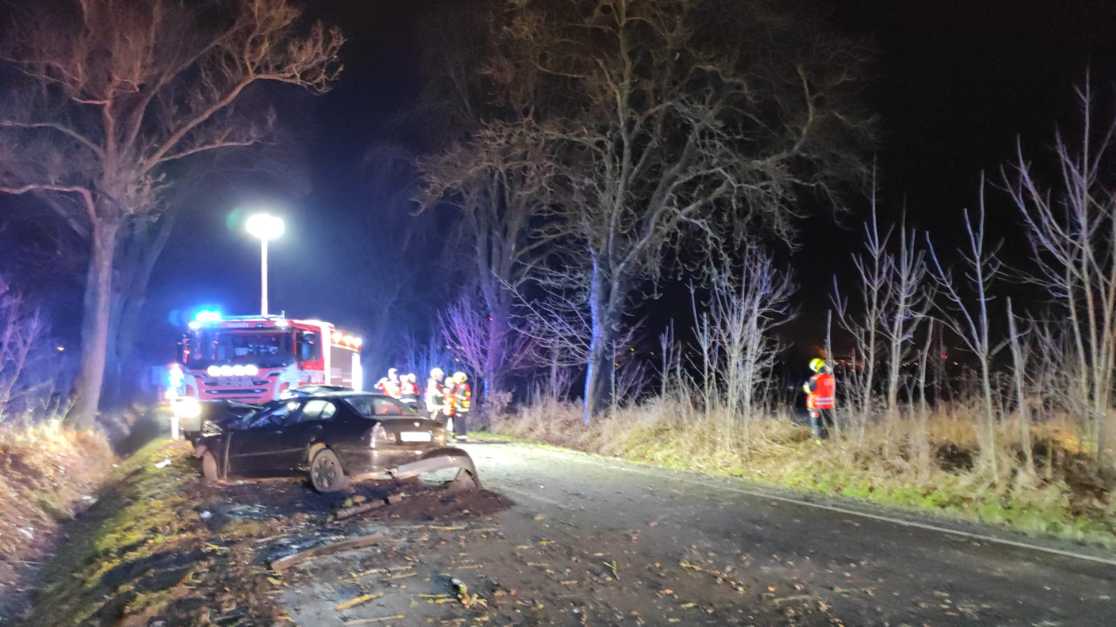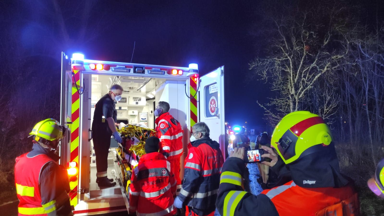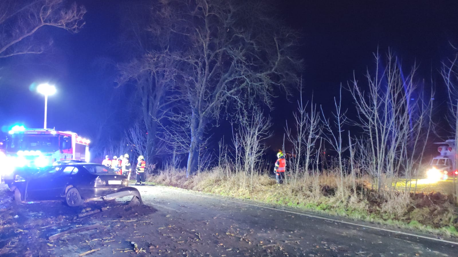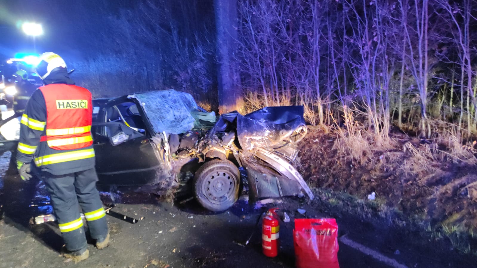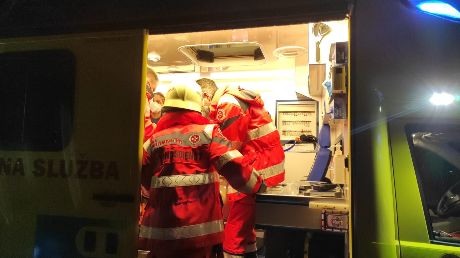 Všichni čtyři cestující z osobního auta s německou registrační zračkou se vážně zranily při nehodě na silnici z Chebu směrem na Svatý Kříž. V době příjezdu hasičů na místo události byly všechny osoby mimo auto, dvě byly v bezvědomí, další dvě byli při vědomí, ale rovněž vážně zraněni. Hasiči asistovali záchranné službě při ošetření všech zraněných, na žádost lékaře pak na poli hned vedle silnice připravili prostor pro přistání záchranářského vrtulníku. Další vrtulník byl povolán z Německa, ten nakonec na místo nepřiletěl, přijela místo něj sanitka německé záchranné služby. Po odvezení všech zraněných hasiči zajistili únik provozních kapalin, osvětlovali místo nehody pro potřeby policie a s použitím hydraulických nástrojů museli rozebrat deformované části vozidla pro potřeby vyšetřování nehody ze strany policie. Nehoda se stala ve středu v půl šesté večer, provoz byl od začátku zásahu zcela uzavřený, provoz zde byl obnovený hodinu po půlnoci.