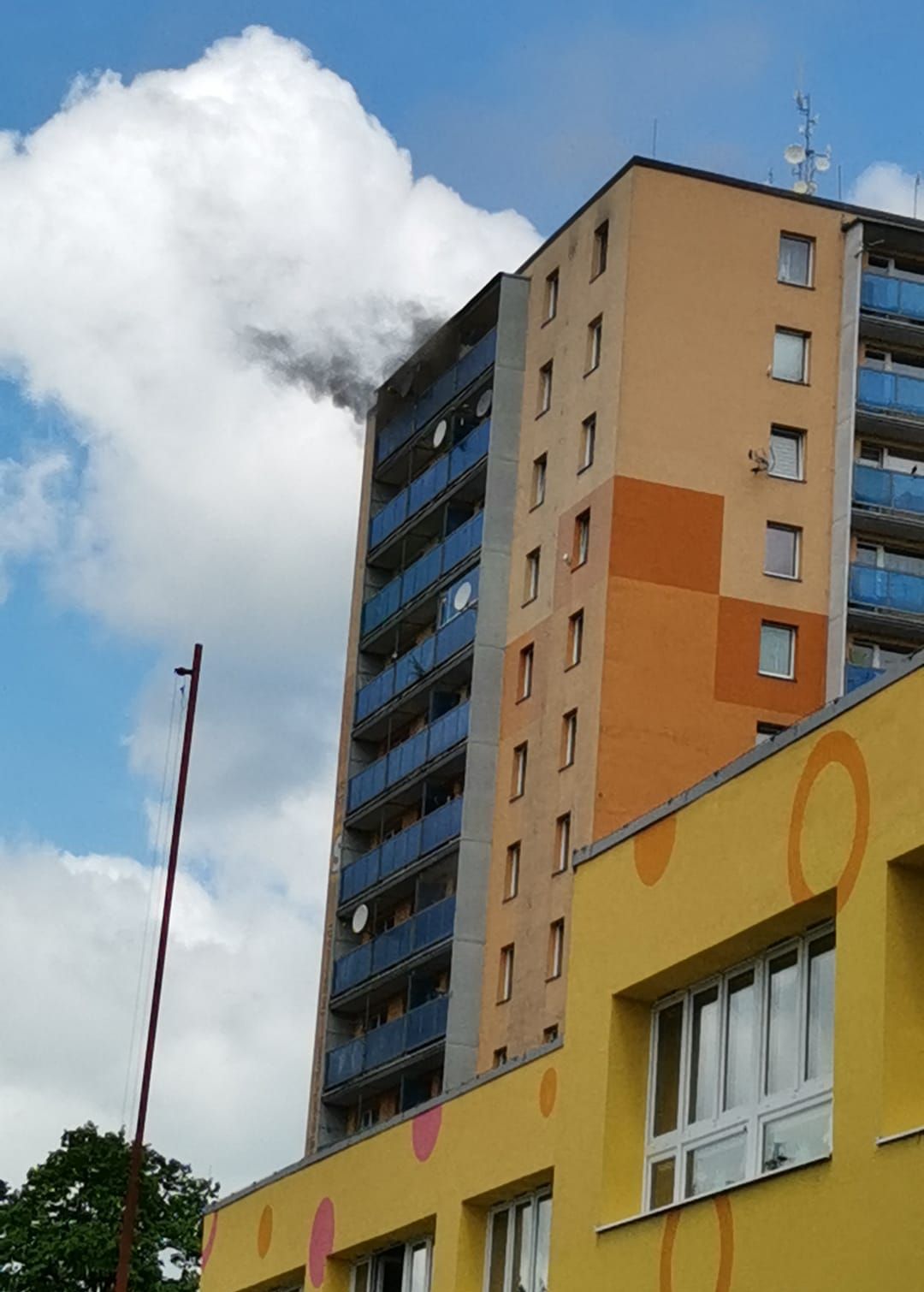 Šest jednotek hasičů zasahovalo v úterý před polednem v Chodově na Sokolovsku u požáru ve třináctipatrovém bytovém domě. Uvnitř domu hořela elektroinstalace mezi osmým a dvanáctým patrem. Oheň se do dalších prostorů domu nerozšířil, pět nejvyšších pater zaplnil kouř. Z nejvyššího patra museli hasiči zachránit dvě osoby, bezpečně na zem je dostali v koši automobilového žebříku. Po likvidaci požáru hasiči odvětrali zakouřené prostory a zkontrolovali všechny byty v patrech, kde hořelo. Do některých bytů vstoupili z výškové techniky, do dalších bytů museli použít násilné vniknutí. Při požáru se celkem sedm osob nadýchalo kouře, na místě je ošetřila záchranná služba, jednu osobu pak převezla do nemocnice. Čtyřicet osob opustilo dům samovolně při zjištění, že v objektu zasahují hasiči. Po požáru v části domu nefungoval přívod elektrické energie a výtah, nikdo z obyvatel ale nevyžadoval zajistit náhradní ubytování. Škoda způsobená požárem je předběžně odhadnuta na jeden milion korun, příčinu požáru elektroinstalace zjišťuje vyšetřovatel požárů.