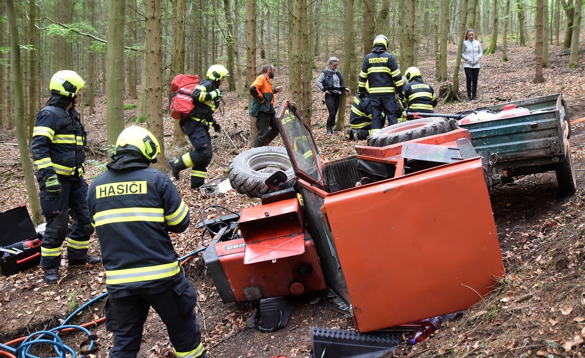 V kabině převráceného traktoru zůstal zaklíněný řidič