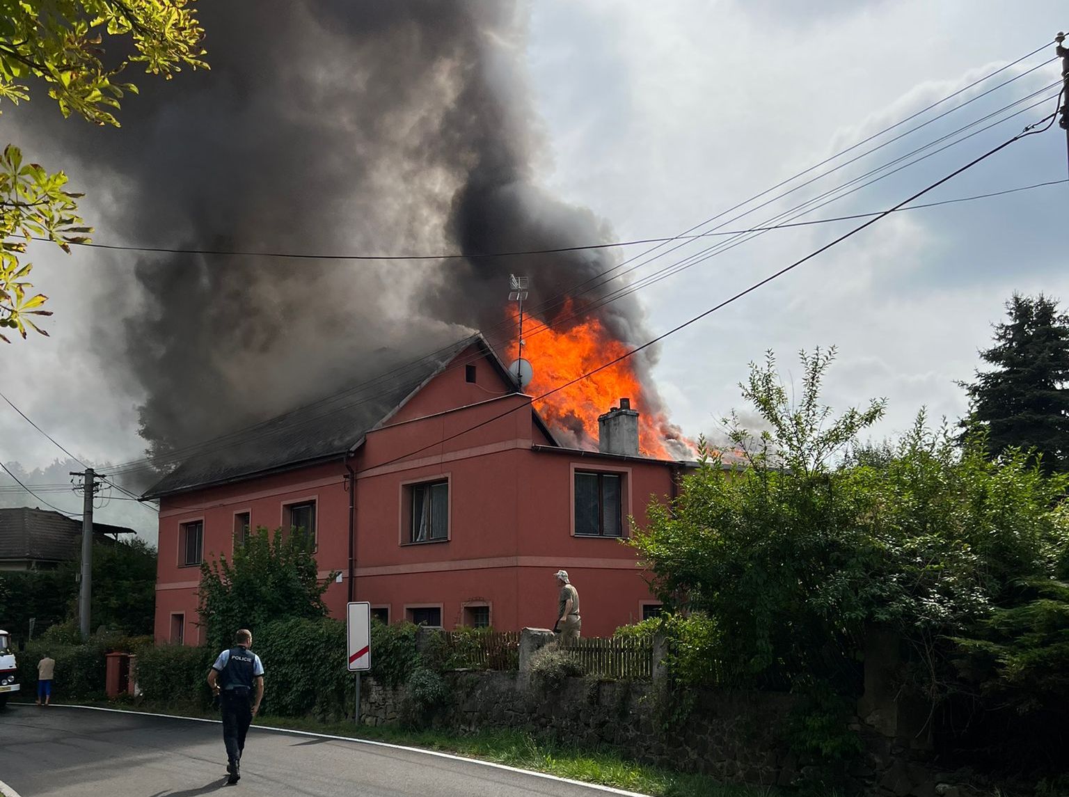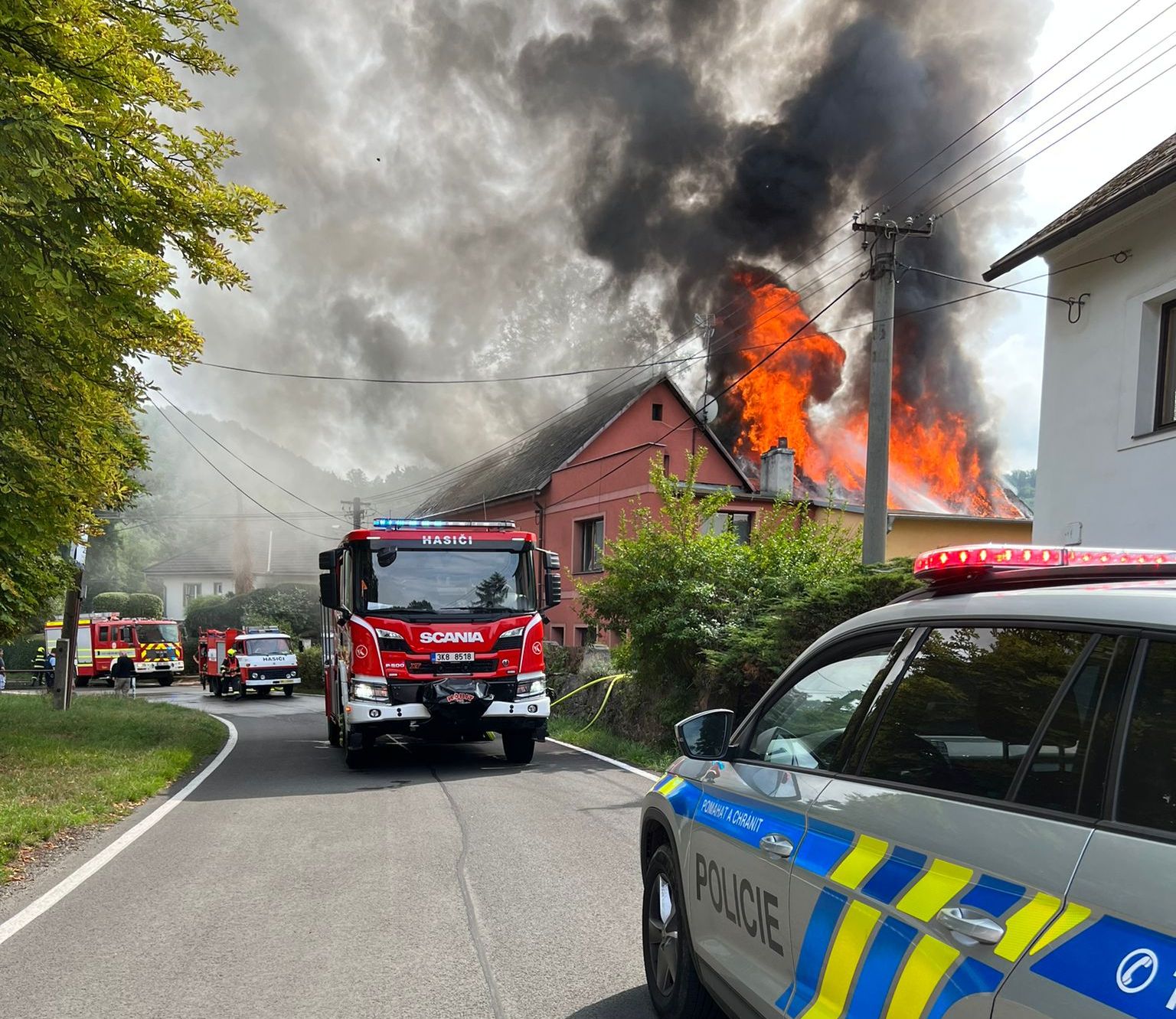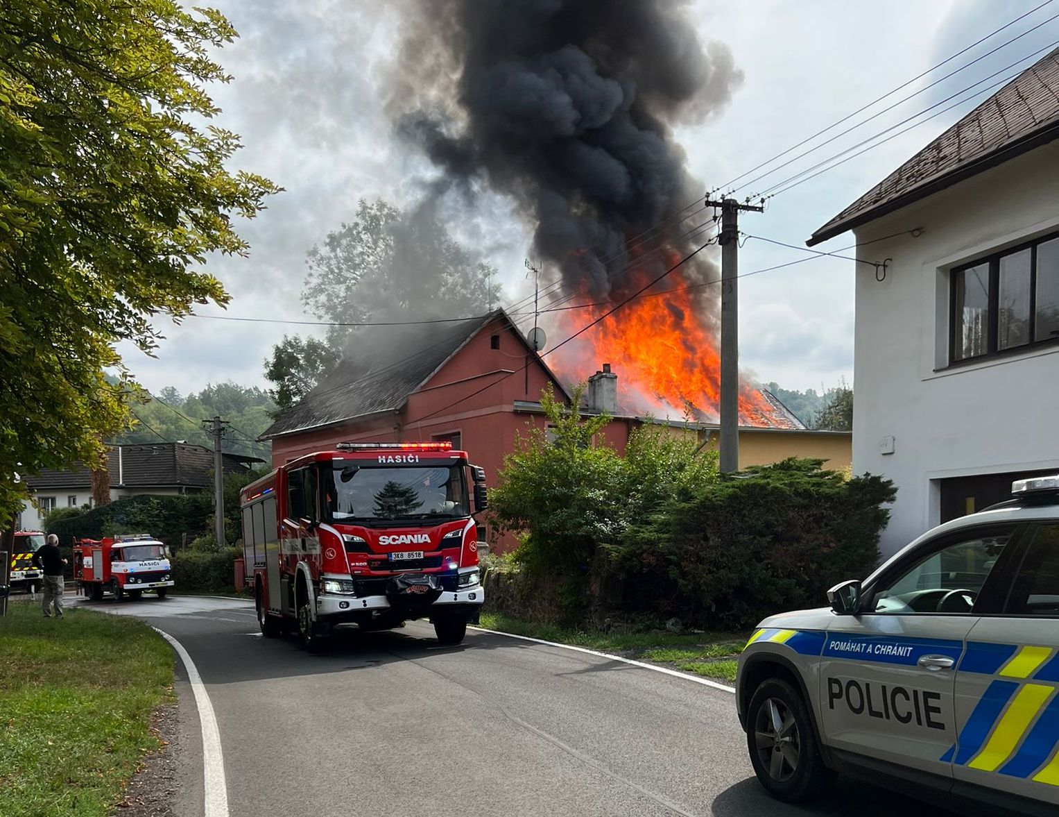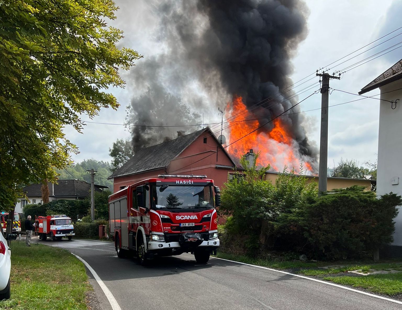 Druhý víkendový požár způsobil ještě větší škody. V neděli po poledni začal hořet rodinný dům s přístavky ve Vojkovicích. Také zde hasiči po příjezdu na místo potvrdily, že oheň zasáhl téměř celou střechu domu a že je potřeba více posilových jednotek. Velitel zásahu vyhlásil II. stupeň požárního poplachu. Plameny se šířily na hlavní obytnou část domu, přeskočení ohně se podařilo hasičům zabránit. V začátku se dva obyvatelé domu a také jedna osoba ze sousedství nadýchali kouře, na místě je zkontrolovala záchranná služba, jednu osobu převezla na ošetření do nemocnice. V průběhu zásahu pak došlo k přehřátí jednoho ze zasahujících hasičů, rovněž byl ošetřený na místě záchranou službou. Zásah hasičů trval až do večerních hodin, bylo nutné vyhledávat ve vyhořelém podkroví všechna skrytá ohniska. Prvotní odhad škody je více než tři miliony korun, příčina je v šetření. Na místě zasahovali profesionální hasiči z Karlových Varů, Toužimi a Klášterce nad Ohří a dobrovolní hasiči z Vojkovic, Ostrova, Kyselky, Merklína, Hájku a Jáchymova.