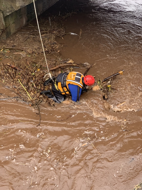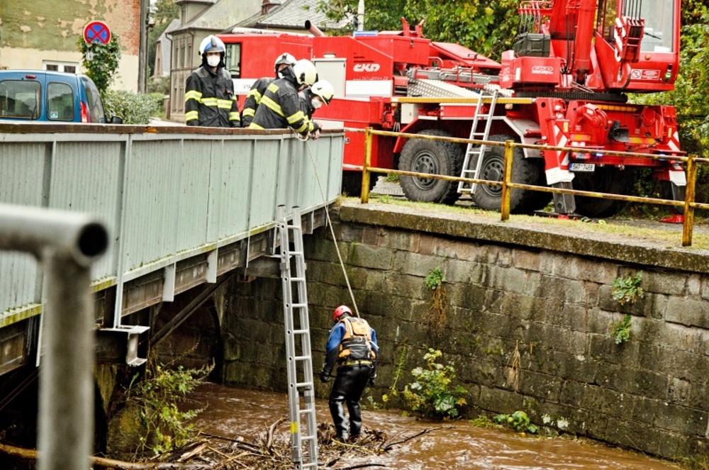 V části Dolní Adršpach prováděly jednotky hasičů monitoring řeky Metuje, která se místy vylévala z koryta.