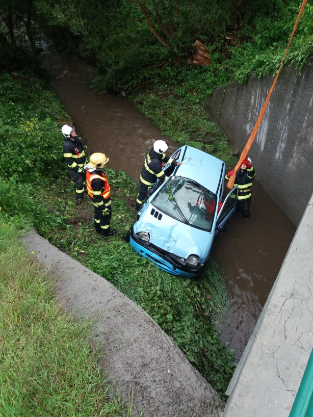 V katastru Červeného Kostelce vyjel mimo komunikaci osobní automobil a sjel do potoka. Na místo události vyrazili profesionální hasiči z Náchoda a JSDH Červený Kostelec. Jednotky zabezpečily místo zásahu a zkontrolovaly, zda z vozidla neunikají do vody provozní náplně, což se nepotvrdilo. Řidič vozu byl předán do péče posádky ZZS.