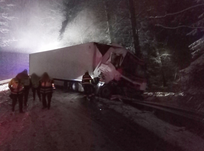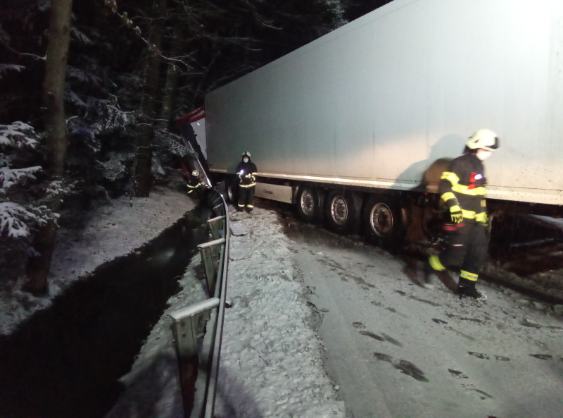 Po půlnoci se střetly na silnici č. 35 mezi Hradcem Králové a Býští dva nákladní automobily, z toho jeden vyjel mimo komunikaci do svodidel a blokoval provoz na komunikaci. Jedna osoba skončila v péči posádky ZZS, profesionální jednotka hasičů z královéhradecké centrály zajistila místo události a zabezpečila havarovaná vozidla. Místo zásahu si převzala následně policie, komunikace byla z důvodu následného vyproštění specializovanou firmou neprůjezdná.
