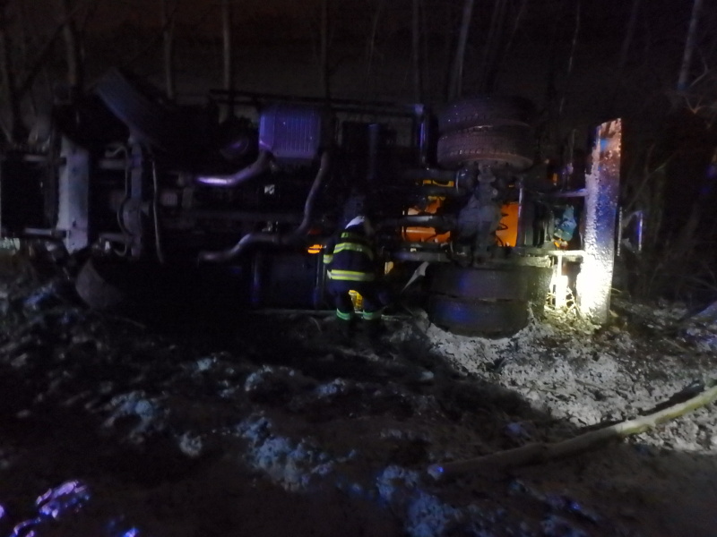 Nedaleko obce Písek byl objeven posypový vůz, který se nacházel převrácený na boku mimo komunikaci, nikdo z posádky vozu zde nebyl. Hasiči místo zkontrolovali a prověřili, zda nedochází k úniku provozních kapalin. Vozidlo mělo mít zajištěné vyproštění v ranních hodinách. Na místě zasahovala profesionální jednotka z Nového Bydžova.