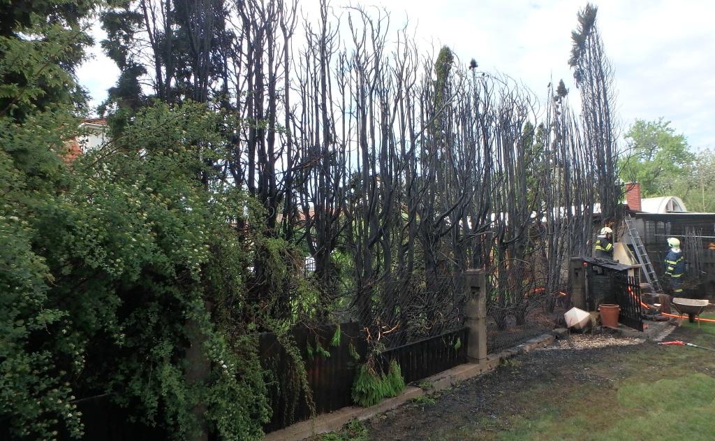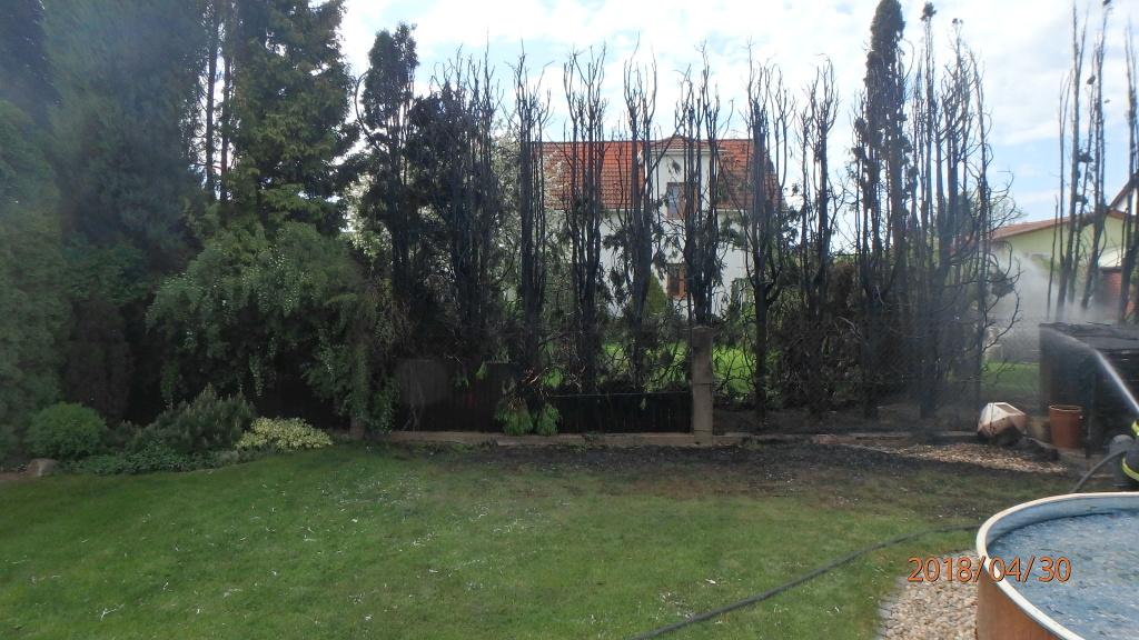 Na Náchodsku likvidovali jaroměřští profesionální a dobrovolní hasiči požár tújí v Bachmačské ulici v 16:18 hod. Hořící stromy se nacházely na zahradě v blízkosti domu a garáže. Túje začaly hořet poté, co přeskočila jiskra ze zapáleného zahradního krbu. Předběžná škoda byla vyčíslena na 100 tisíc korun. Zásahem se podařilo uchránit hodnoty ve výši asi 300 tisíc korun.
