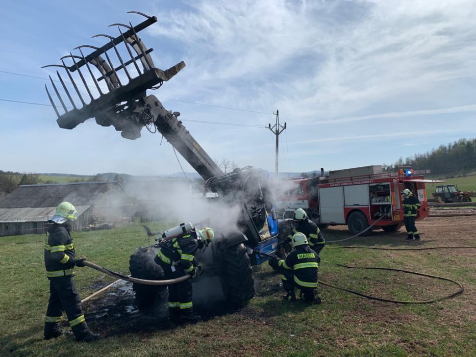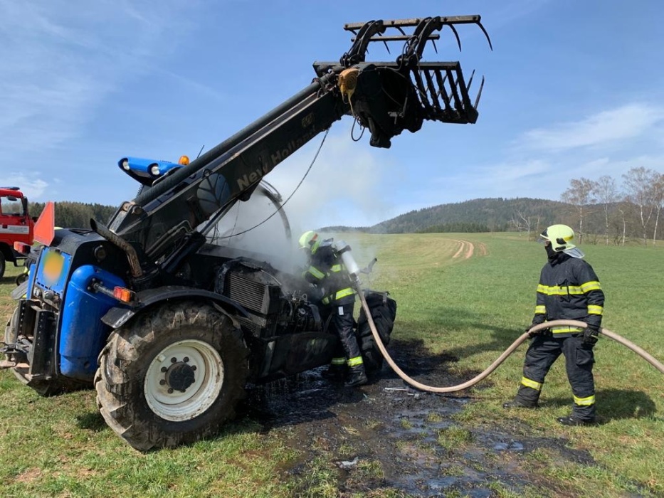 K požáru čelního nakladače na louce vyjížděli do katastru části Ruprechtice profesionální hasiči z Broumova a JSDH Meziměstí...
