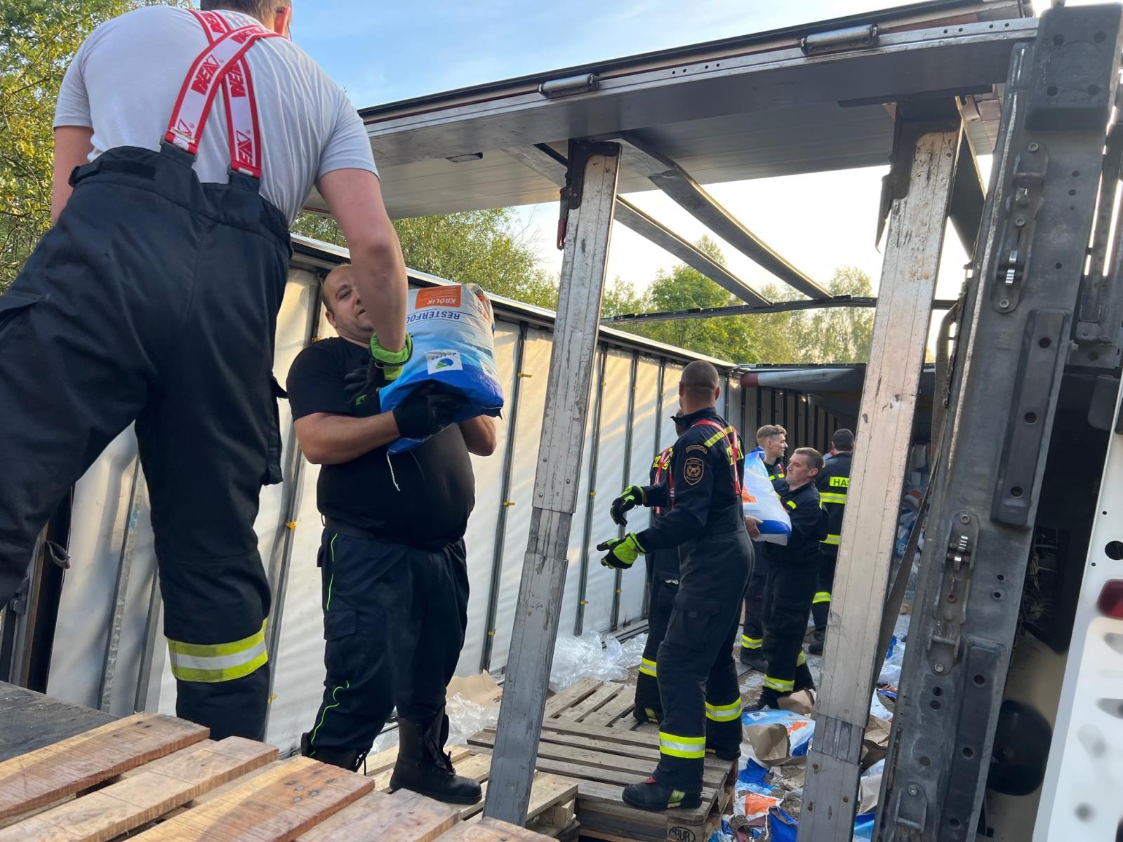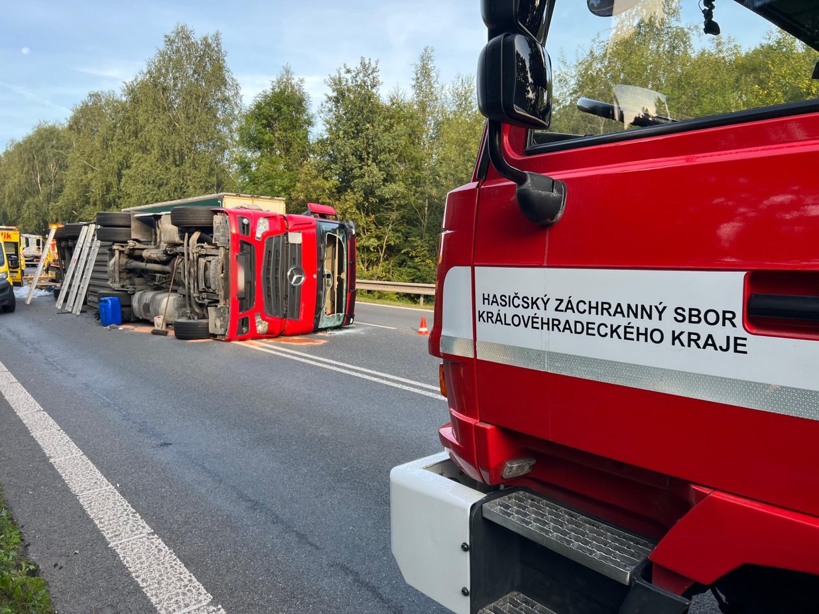 V brzkých ranních hodinách havaroval na silnici č. 33 mezi Vysokovem a Náchodem nákladní automobil, který se převrátil na bok. Zaklíněného řidiče museli hasiči z kabiny vyprostit, do péče si ho převzala posádka ZZS. Na místě zasahovali profesionální hasiči z Náchoda a JSDH Nové Město nad Metují a Náchod, místo zabezpečili a pracovali několik dalších hodin na odstranění následků nehody. Z převráceného kamionu uniklo menší množství pohonných hmot, jednotky je zasypaly sorbentem a odstranily. Aby mohl být vůz naložen na odtah, museli hasiči dále pomoci s vyskladněním nákladu – jednalo se o pytle s krmivem. O vrácení vozu zpět na kola a jeho odvoz se postarala specializovaná firma. Komunikace byla plně zprůjezdněna a uklizena až před 11. hodinou.