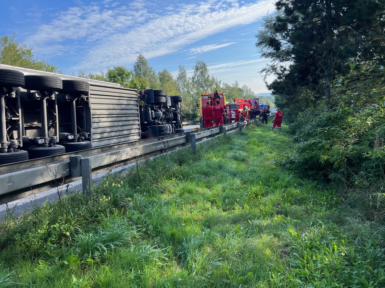Dopravu na silnici č. 33 omezoval několik hodin převrácený kamion