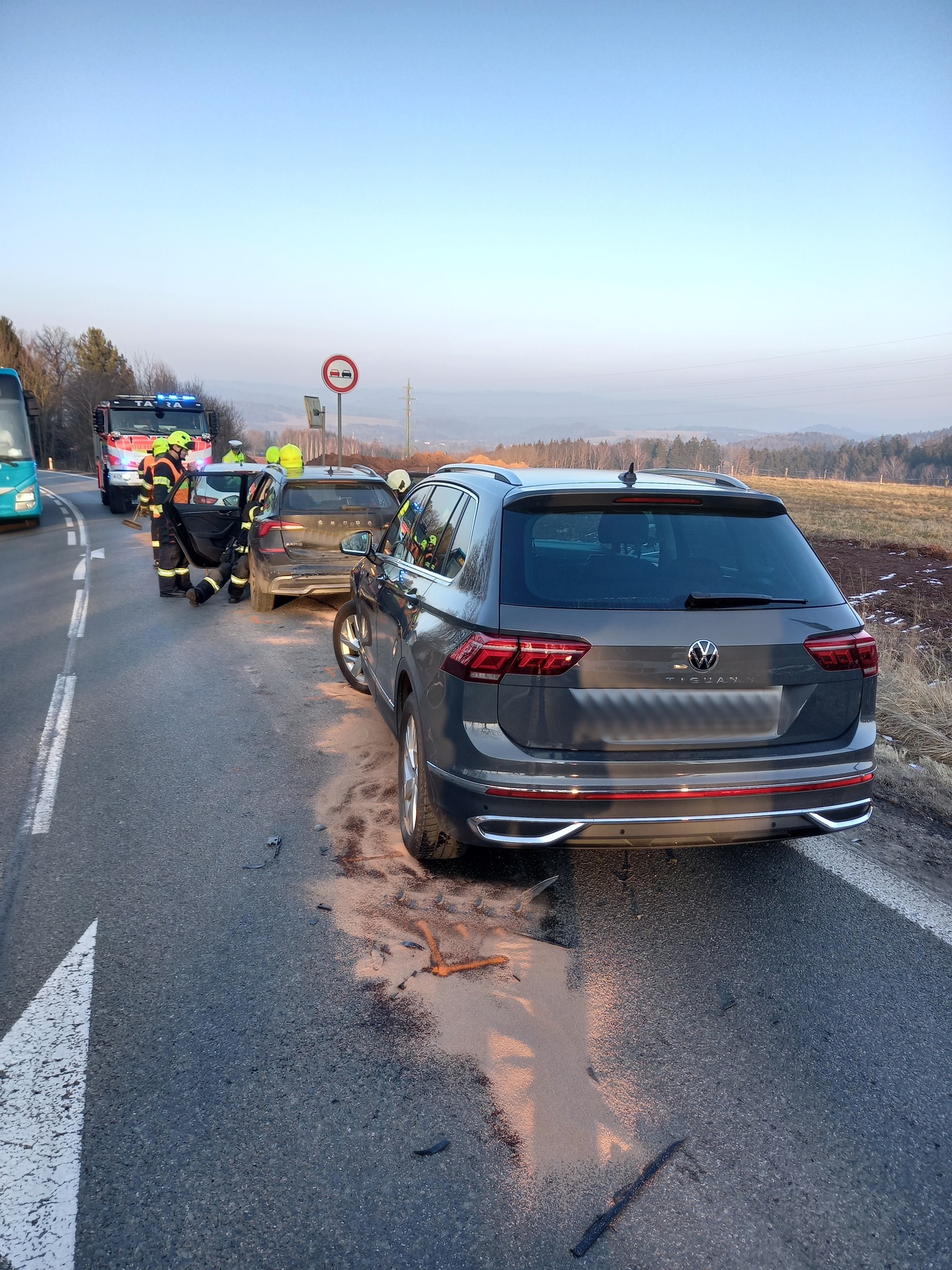 Neuběhlo ani dvacet minut a hasičské jednotky obdržely další tísňové volání. Tentokrát se srazila tři osobní vozidla v Dřevěnicích na Jičínsku. Scénář byl téměř totožný – rozbitá vozidla, rozsypané úlomky, unikající provozní kapaliny a nervózní účastníci nehody. Naštěstí v tomto případě nebyl nikdo vážně zraněn. Hasiči opět zasáhli s maximální rychlostí, zabezpečili místo nehody, provedli protipožární opatření a postarali se o úklid silnice.
