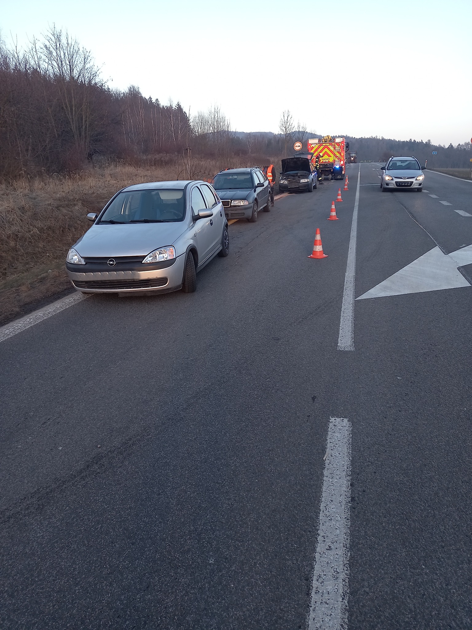 První nehoda byla hlášena krátce po poledni. Hasiči dorazili na místo během několika minut a ihned začali s protipožárními opatřeními, aby zabránili případnému vznícení havarovaných vozidel. Kromě toho poskytli první pomoc dvěma zraněným osobám, které utrpěly lehká až středně těžká zranění. Ty si následně do své péče převzali záchranáři z krajské zdravotnické služby. Hasiči zároveň zajistili únik provozních kapalin, které se začaly šířit po silnici, a pomocí sorpčních materiálů je odstranili. Kvůli zásahu musela být komunikace na několik desítek minut uzavřena.