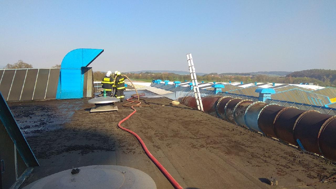 V místě události došlo k požáru odsávacího potrubí od výrobní tvrdící pece. Požár se vzduchotechnikou rozšířil až do komína a zde byly zpozorovány plameny. Hasiči použili k hašení dva C proudy. Jednotky prováděly nejen dohašovací práce u komína, ale také na asfaltové střeše. Pomocí termokamery zkontrolovaly části vzduchotechniky, kudy se požár šířil, zda se v nich nenachází další skrytá ohniska. Zároveň také provedly proplach odsávacího potrubí. Část z něj museli hasiči za pomocí rozbrušovací pily rozebrat. Šíření požáru se podařilo zastavit v 16:30 hod., s lokalizací pomohli hasičům i zaměstnanci firmy. Zpět na své stanice se jednotky vracely po třech hodinách od zahájení zásahu.