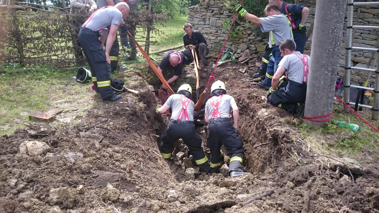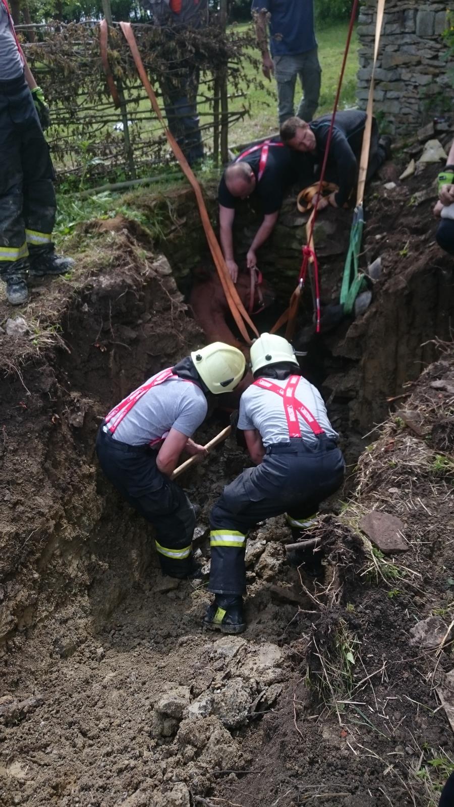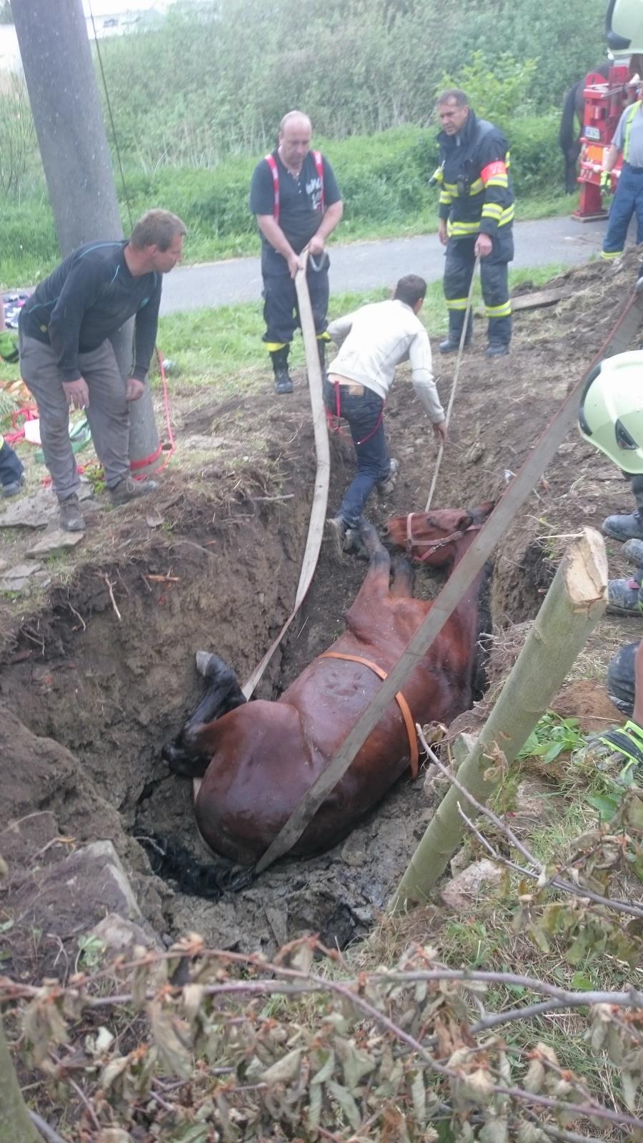 Pomocí bagru bylo nutné odkopat část zeminy, aby hasiči mohli kamennou tři metry hlubokou studnu rozebrat. Poté bylo nutné vykopat jámu, přes kterou by mohl být uvězněný kůň vyproštěn.