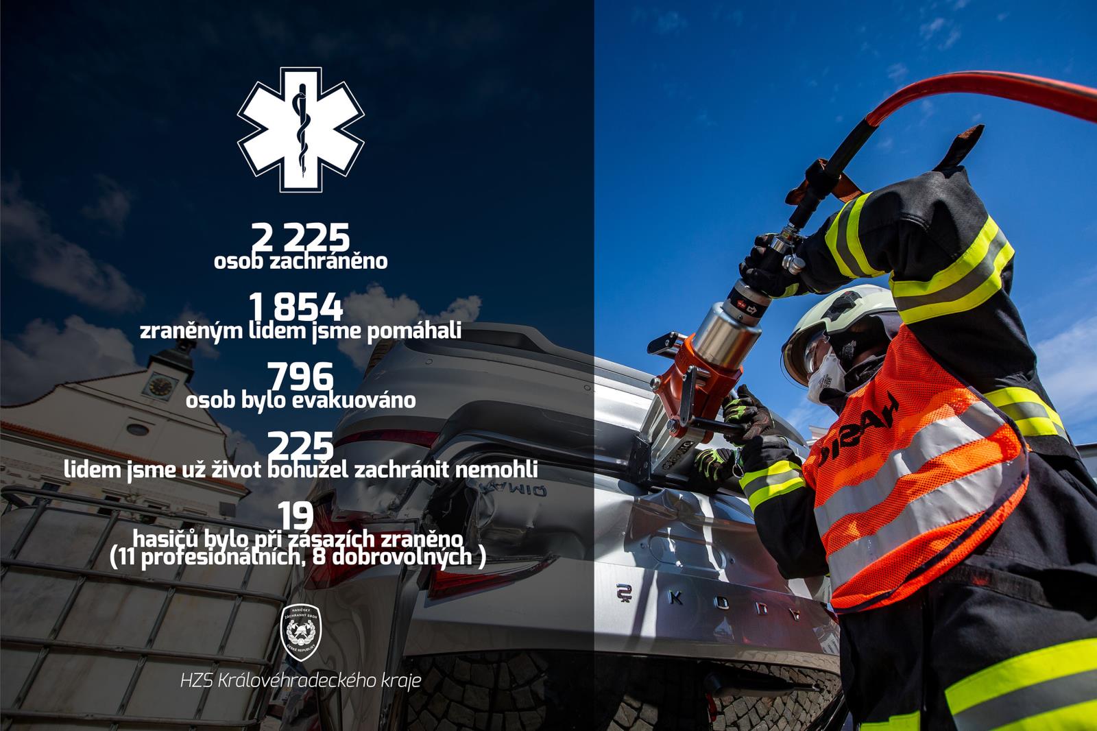 Hasiči v Královéhradeckém kraji zachránili před hrozícím nebezpečím loni celkem 2225 osob, 796 lidí evakuovali a pomohli 1854 zraněným osobám. Smutnou statistikou, kde bohužel čísla v loňském roce rostla, jsou počty usmrcených osob. Během mimořádných událostí loni zemřelo 225 lidí (nárůst o 17).