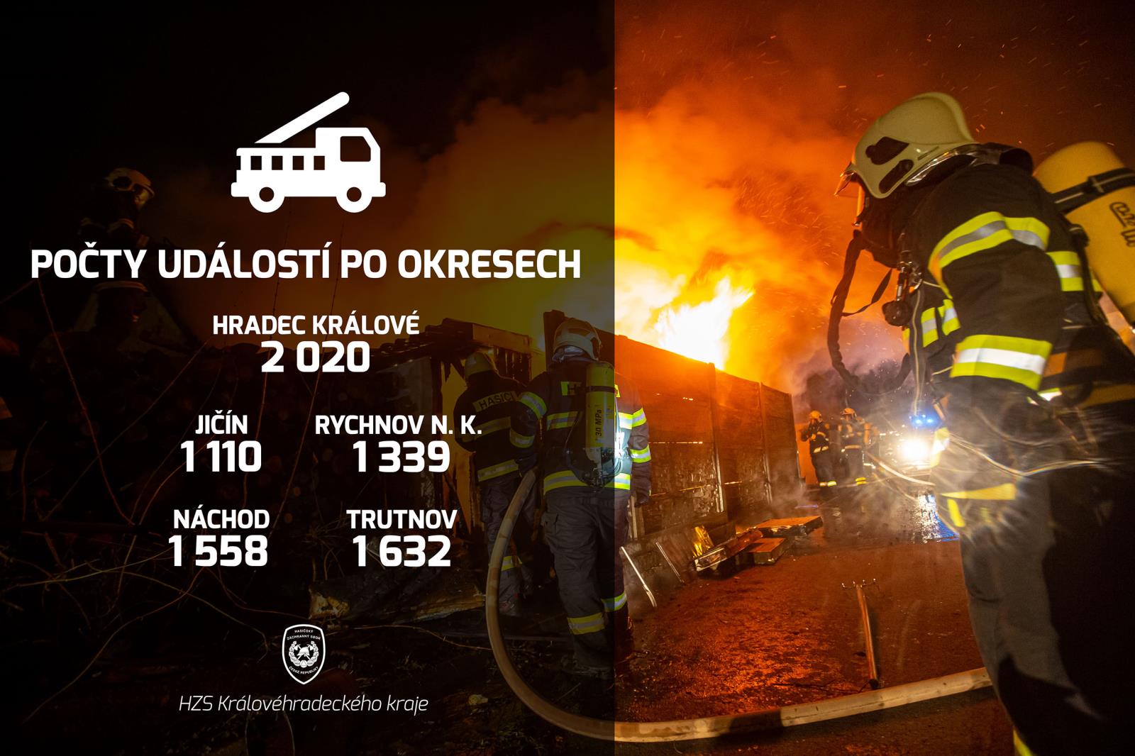 Během požárů zemřelo v loňském roce devět osob, o jednu více než v roce 2019, zraněno bylo 51 lidí. Nejvíce zásahů při požárech evidují hasiči v okresu Hradec Králové (201), dále v okresu Náchod (192), Trutnov (171), Rychnov nad Kněžnou (124) a nejméně v okresu Jičín (115). Nejtragičtější bilanci měla dopravní nehoda s následným požárem z 31. května 2020, kdy došlo na silnici č. 33 u Černožic ke střetu dvou osobních vozidel. Tři osoby na místě zemřely, jedno dítě bylo zraněné předáno do péče zdravotnické záchranné služby.