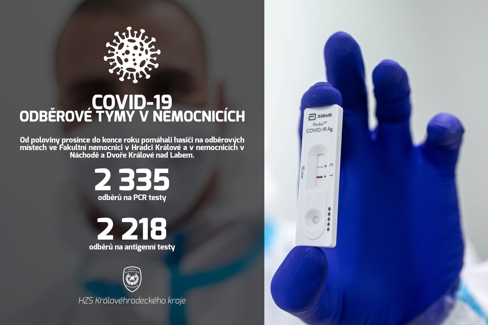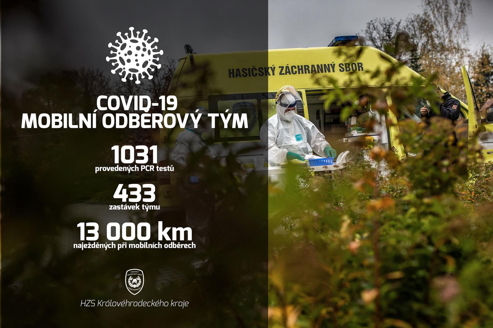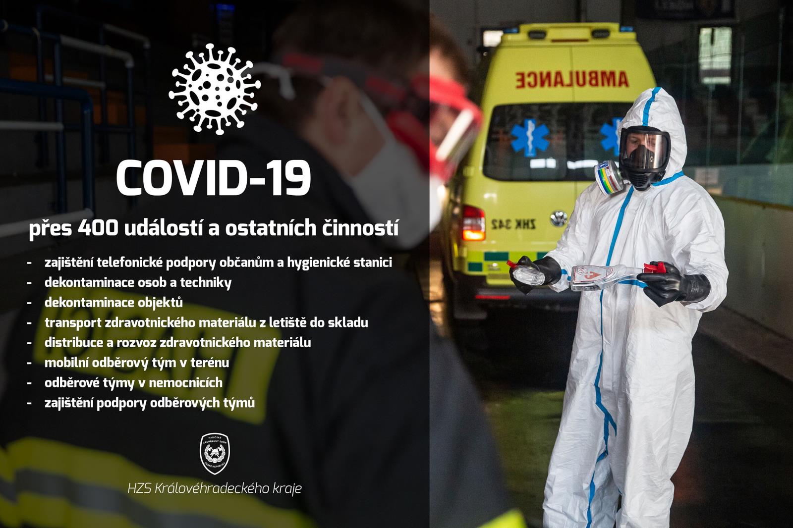Při podílení se na zvládnutí epidemie COVID-19 plnil v průběhu roku 2020 Hasičský záchranný sbor Královéhradeckého kraje úkoly, během kterých je evidováno více než 400 událostí a ostatních činností s nimi spojených. Kromě dekontaminací osob, techniky a prostor, zajišťovali příslušníci transport zdravotnického materiálu a distribuci ochranných pomůcek v rámci Královéhradeckého kraje i mimo něj. Dále zajišťovalo operační středisko telefonickou podporu občanům a hygienické stanici. V období od 31. 10. 2020 do 17. 12. 2020 vyrážel každý den do terénu mobilní odběrový tým hasičů, který za uvedené období provedl PCR testy u 1031 osob na 433 místech, přičemž najezdil téměř 13 tisíc kilometrů. Od 18. 12. 2020 se příslušníci HZS KHK zapojili z důvodu vyššího požadavku na testování osob a dostupnosti antigenních testů do činnosti stacionárních odběrových týmů ve Fakultní nemocnici v Hradci Králové a v nemocnicích v Náchodě a Dvoře Králové nad Labem. Zde provedli do konce roku celkem 2335 odběrů na PCR testy a 2218 odběrů na antigenní testy.