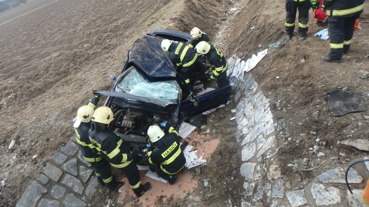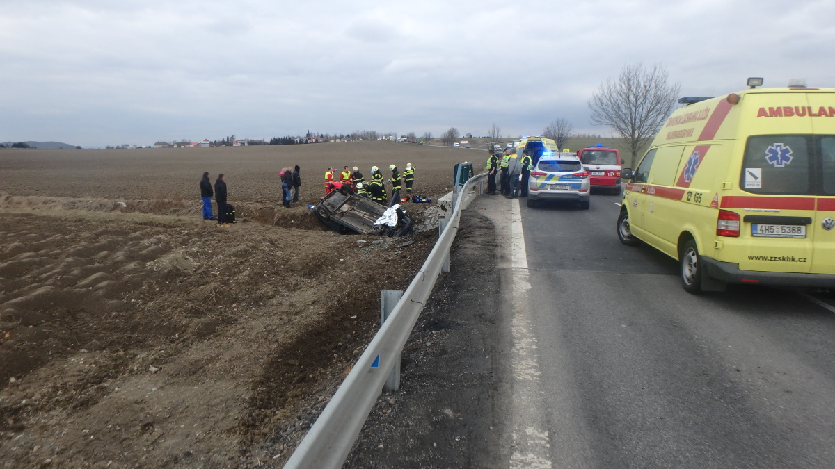 Profesionální i dobrovolní hasiči zasahovali ve čtvrtek, 29.3.2018  po 14. hodině u dopravní nehody dvou osobních automobilů mezi Bílým Újezdem a Ještěticemi na Rychnovsku. Jedno z aut vyjelo ze silnice a skončilo převrácené mimo vozovku.