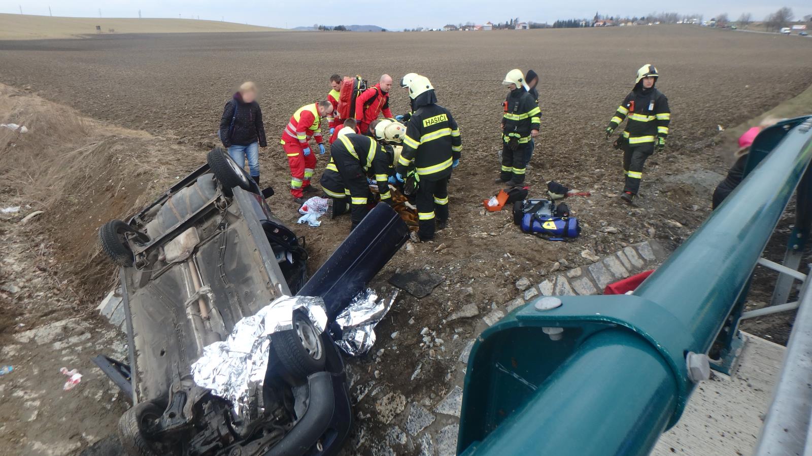 Dvě osoby se nacházely po příjezdu jednotek mimo vozidlo. Hasiči pomáhali záchranářům s ošetřením zraněných a další zajišťovali havarované vozidlo proti vzniku požáru.