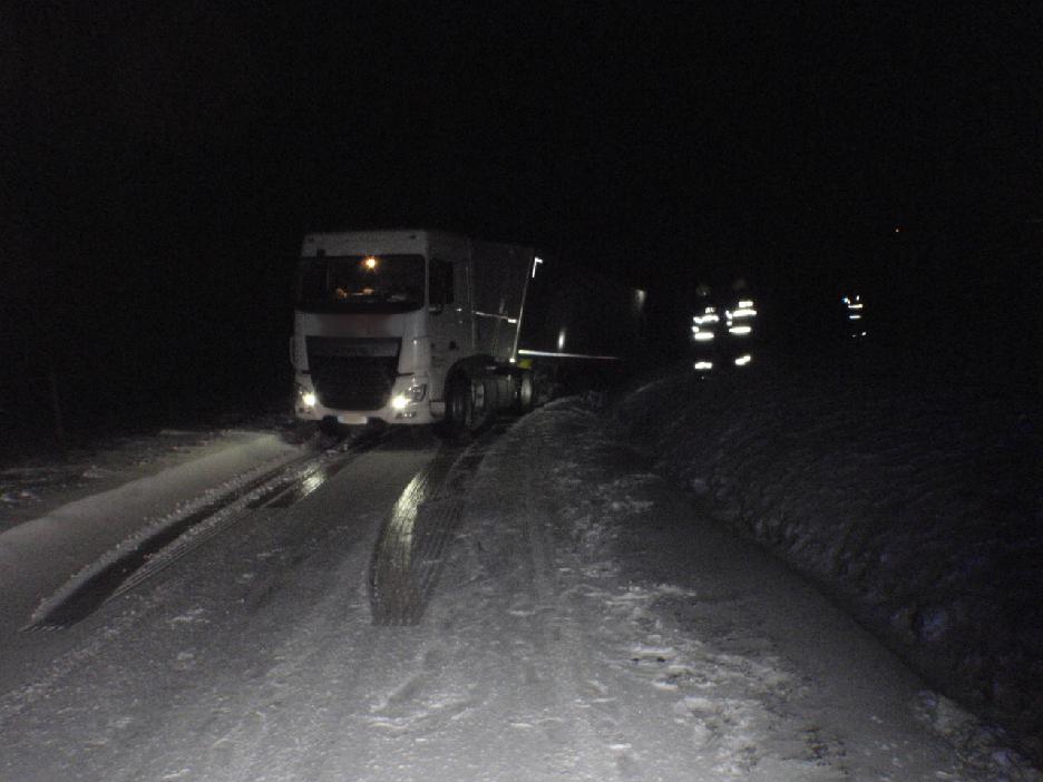 U obce Radkyně pak havaroval na zledovatělé silnici před 20. hodinou kamion, ze kterého vyteklo pivovarské mláto do příkopu a částečně i na silnici. Kamion blokoval celou komunikaci, překládka nákladu a jeho vyproštění budou provedeny v dnešních ranních hodinách