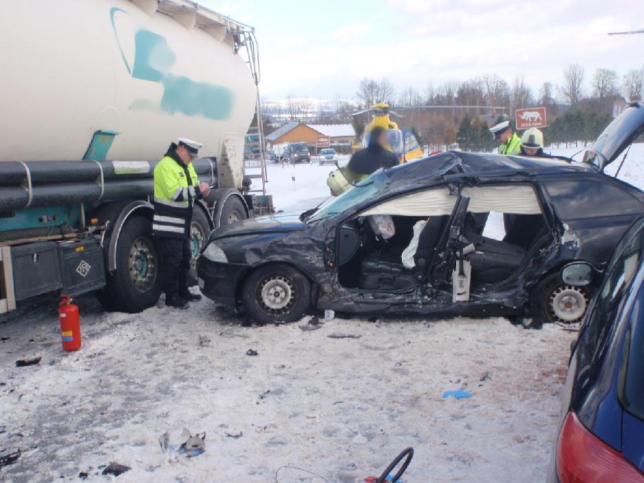 U obce Vidochov museli hasiči po nehodě dvou osobních vozidel a jednoho nákladního dokonce jednu osobu z vozu vyprostit, do nemocnice ji transportoval vrtulník LZS.