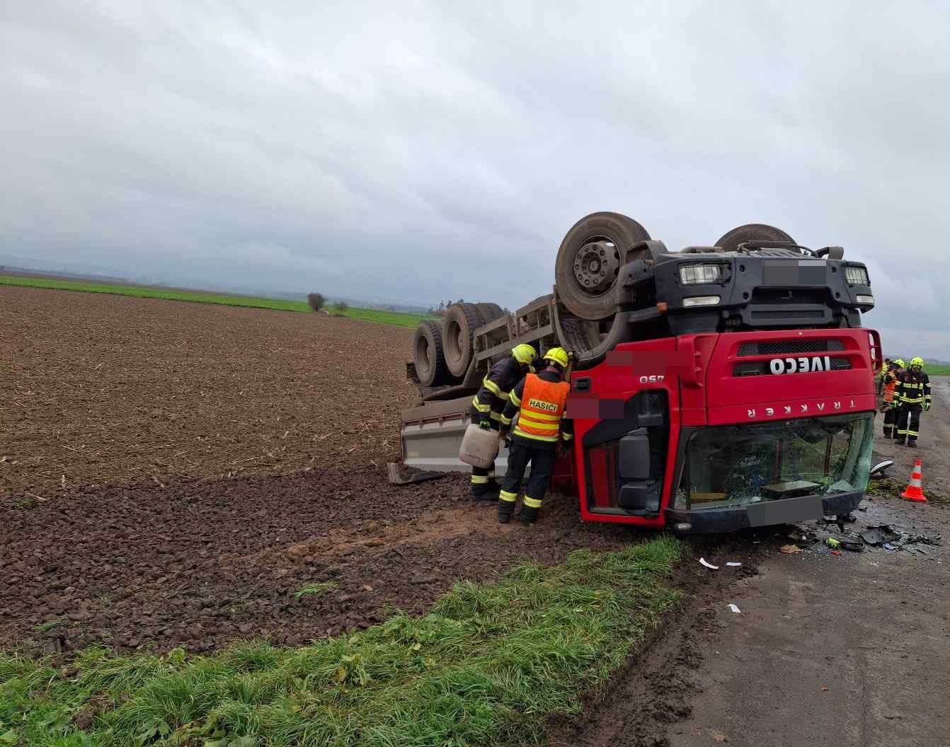 Jedna cesta, dvě nehody: Hasiči zasahovali u převráceného kamionu i u vyproštění zraněného