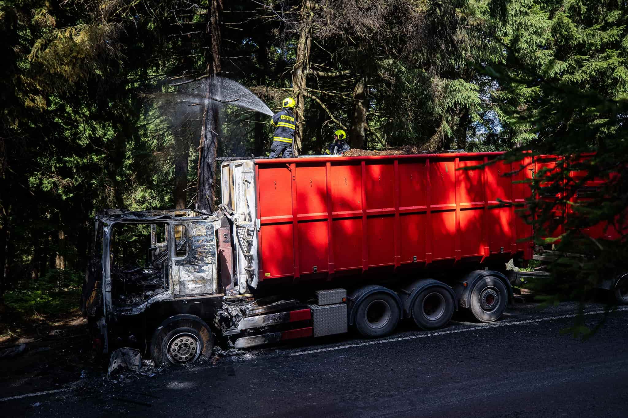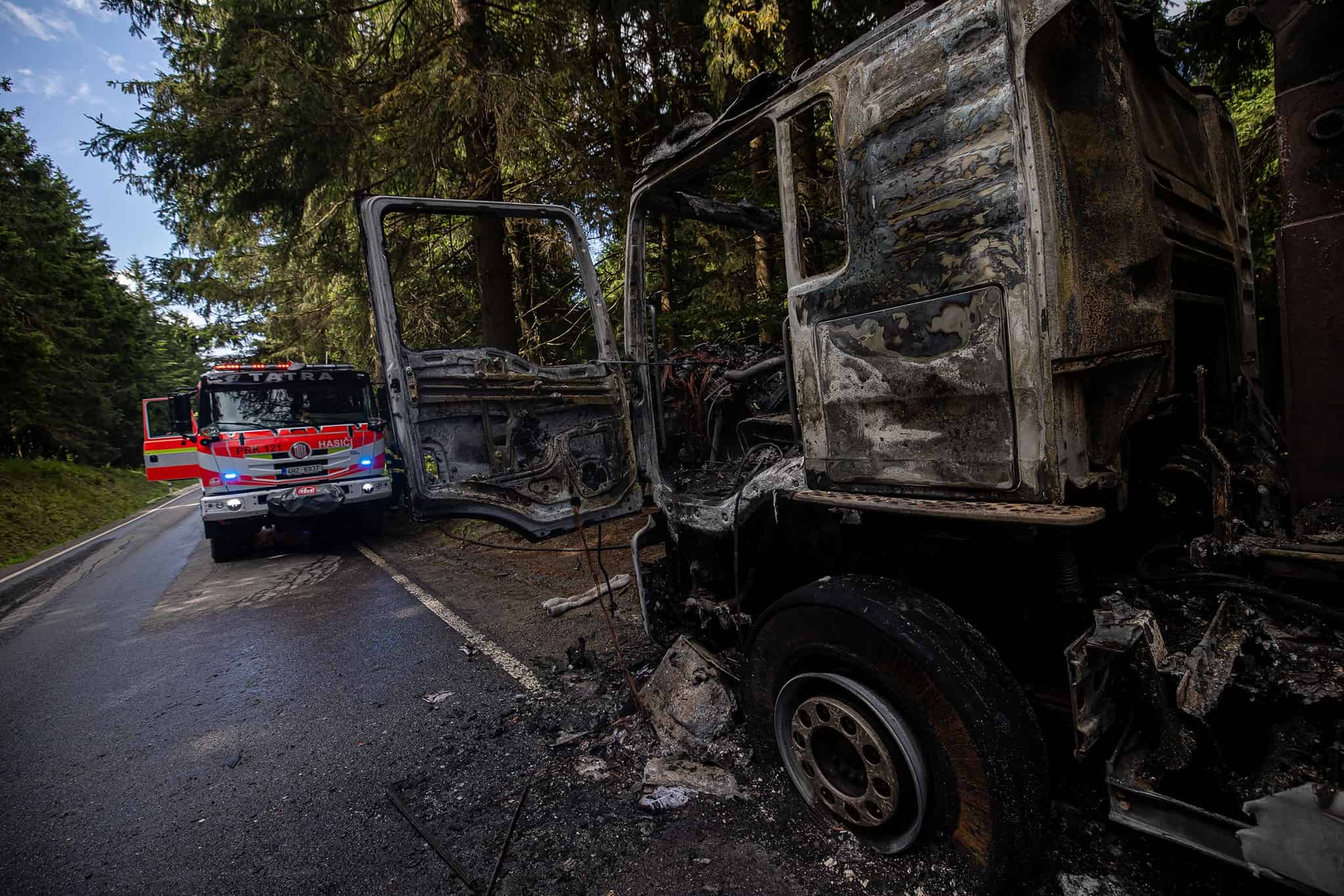 V horském úseku silnice odpoledne vzplál nákladní vůz převážející dřevní štěpku. Oheň se podařilo včas lokalizovat díky rychlému zásahu čtyř jednotek hasičů. Událost se obešla bez zranění i větších škod.