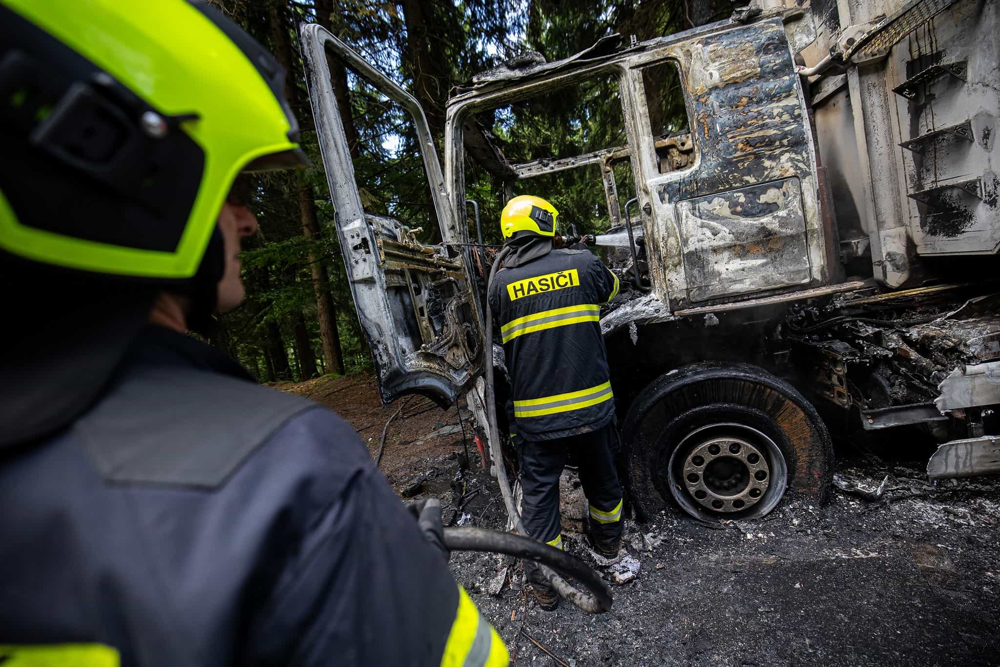 Kamion s nákladem v plamenech. V horském terénu zasahovaly čtyři jednotky hasičů