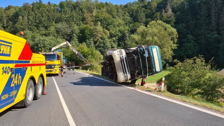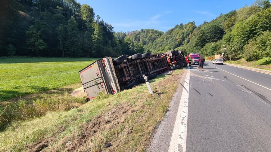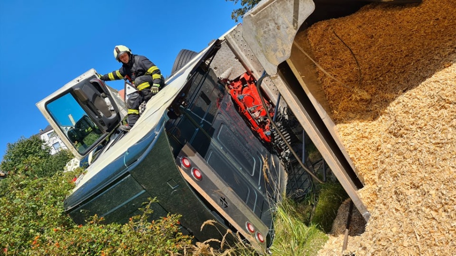 Velké Petrovice – dopravní nehoda – 14. 9. 2020 v 11:00hod. U Velkých Petrovic havaroval na silnici č. 303 kamion převážející štěpku...
