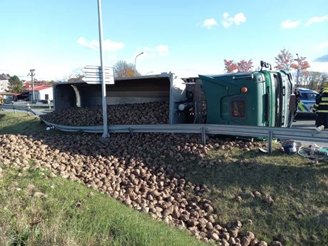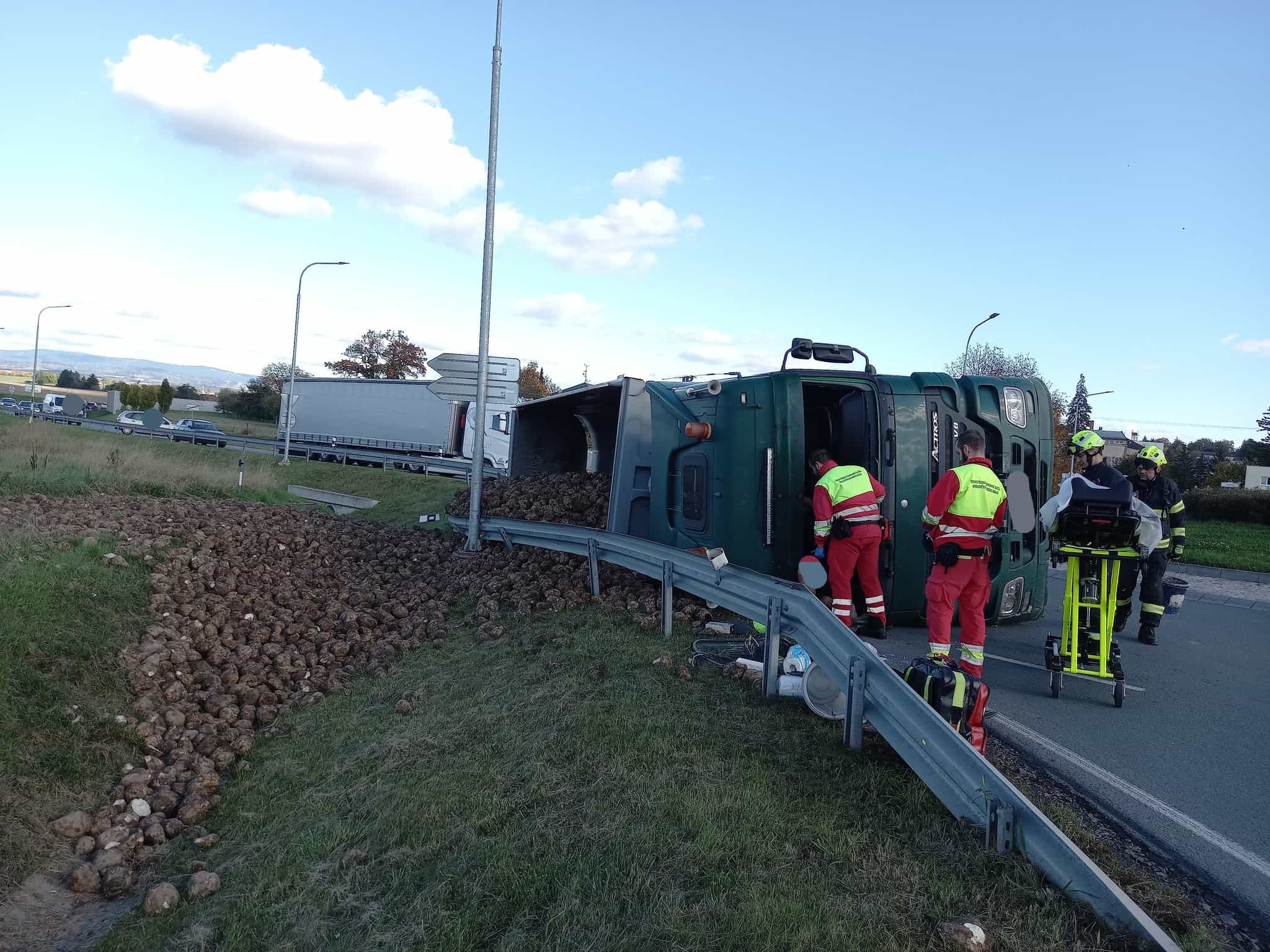 Kamion se převrátil na bok, zraněný řidič skončil v péči záchranářů