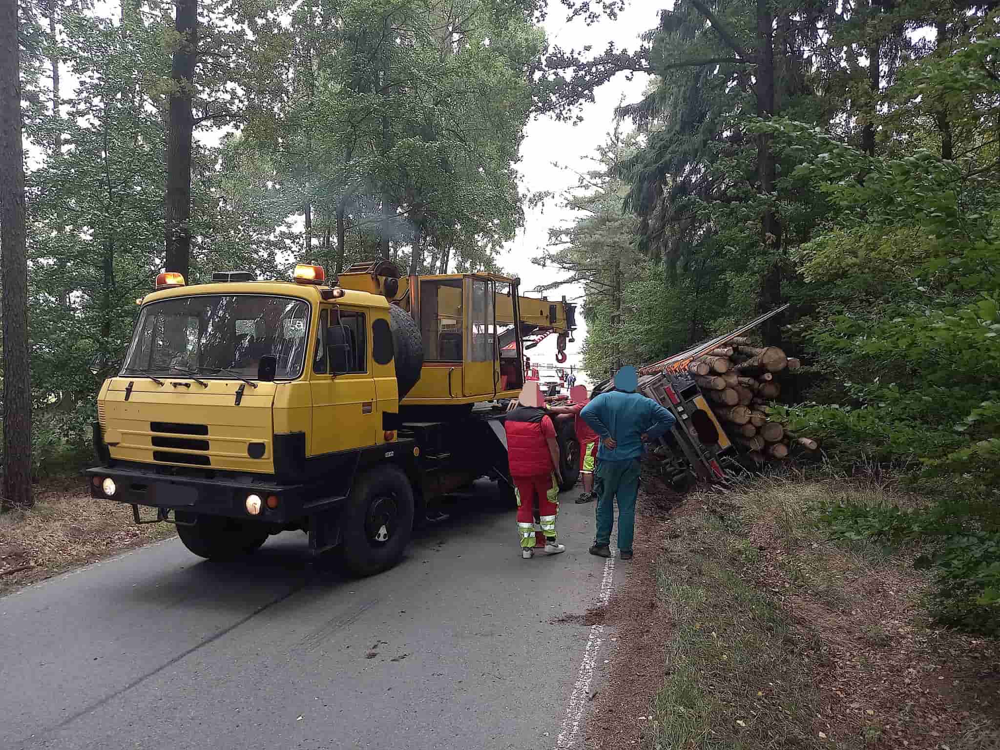 Nákladní auto s dřevem zablokovalo silnici, nasazena těžká hasičská technika