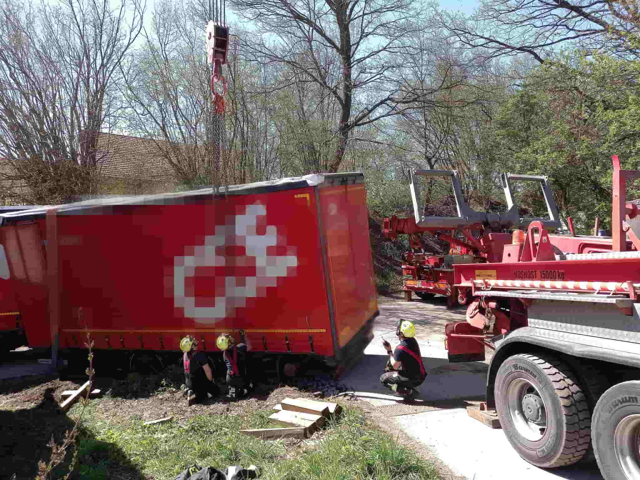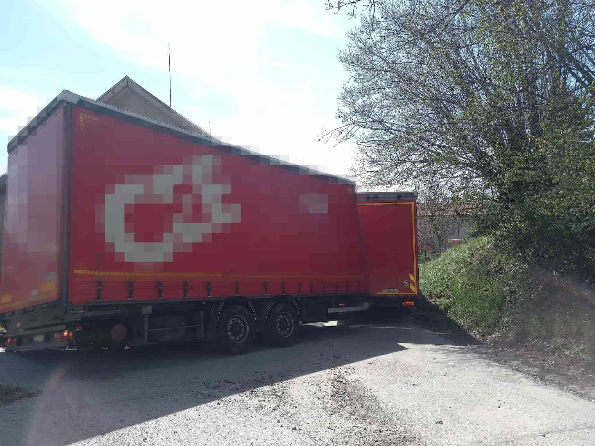 Na místo byly vyslány profesionální jednotky hasičů se dvěma vyprošťovacími automobily. Po příjezdu zjistily, že plně naložené vozidlo je vzpříčené přes komunikaci a jeho vlek se nachází v těsné blízkosti rodinného domu v zatáčce. Hasiči museli postupovat velmi opatrně, aby nedošlo k poškození okolních objektů ani k převrácení vozidla. Pomocí těžké techniky se jim podařilo návěs postupně stabilizovat a vrátit zpět na zpevněnou plochu.