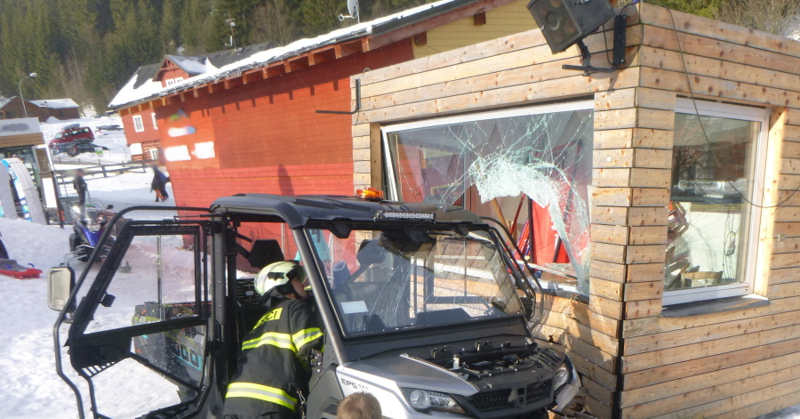 Náraz pásové čtyřkolky do technické budovy vleku