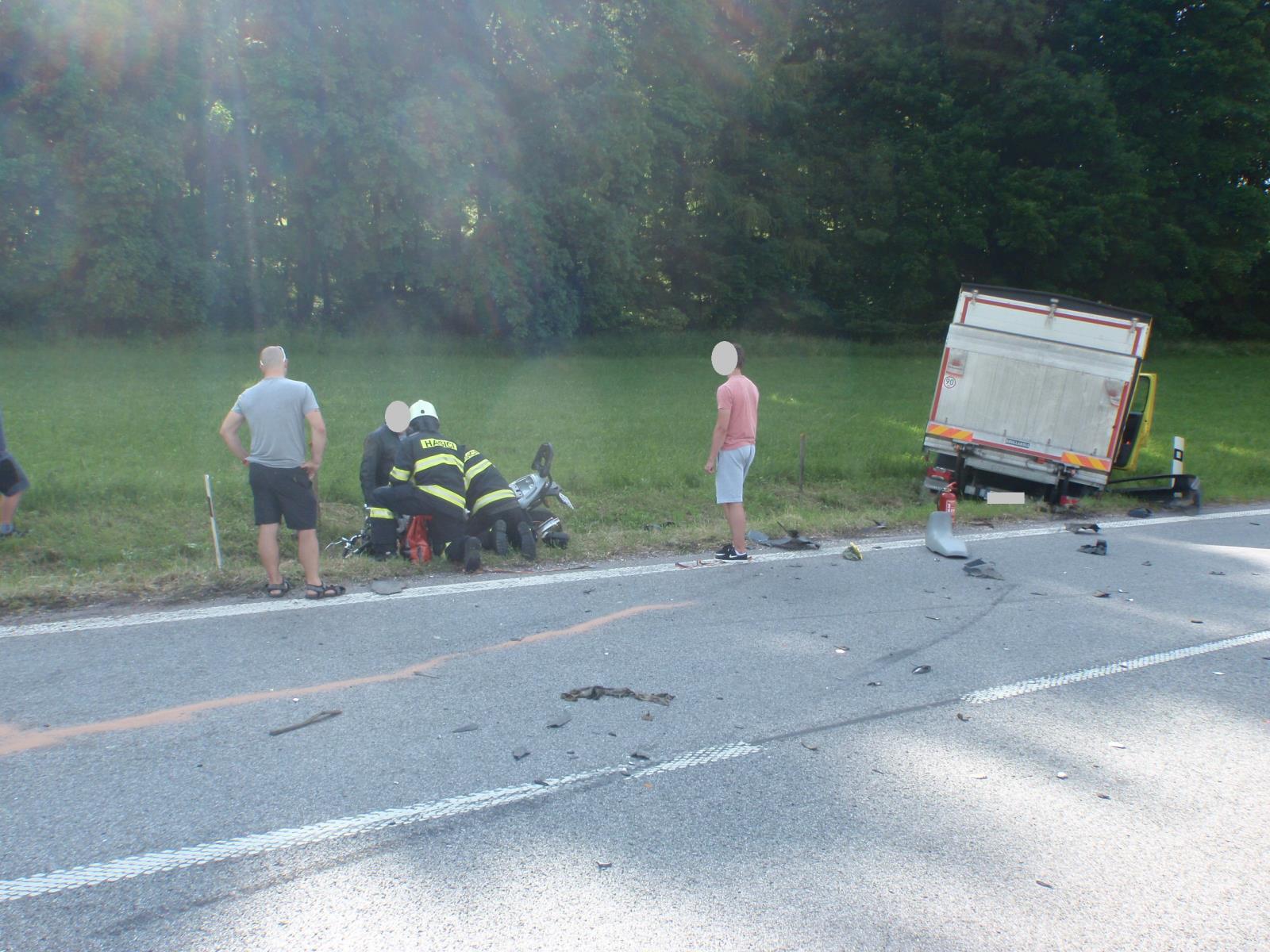 Nehoda dvou motocyklů a dodávky se obešla bez vážnějšího zranění