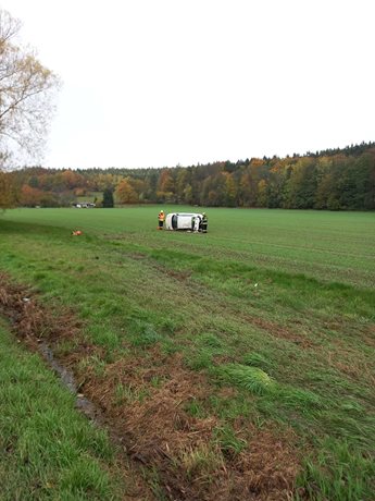 Nehoda na silnici skončila autem v poli a zraněním