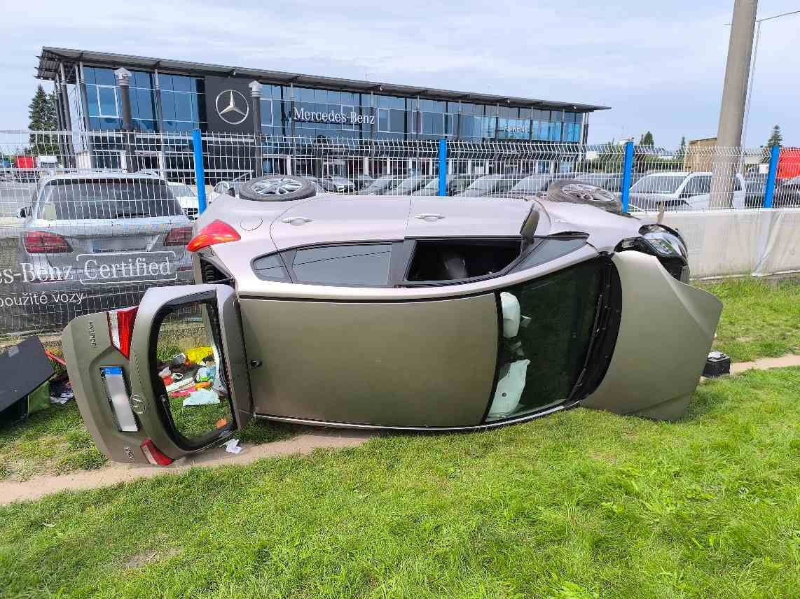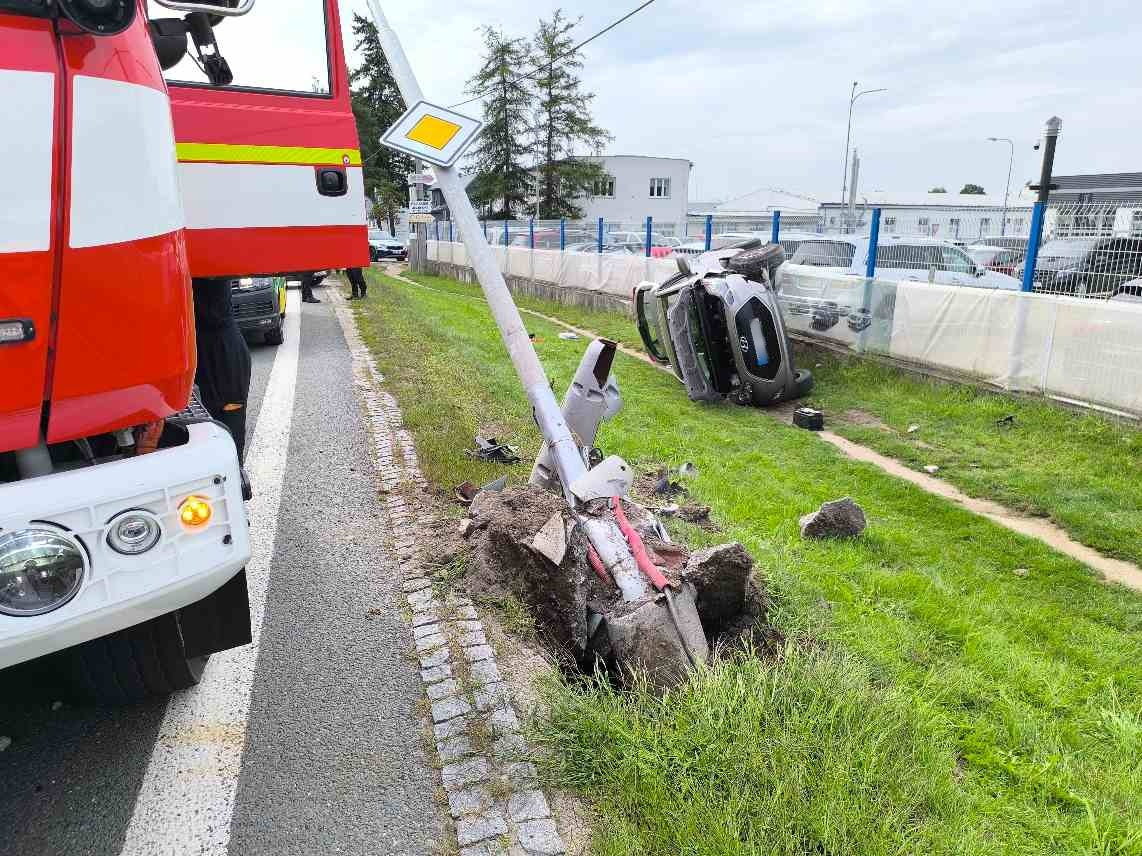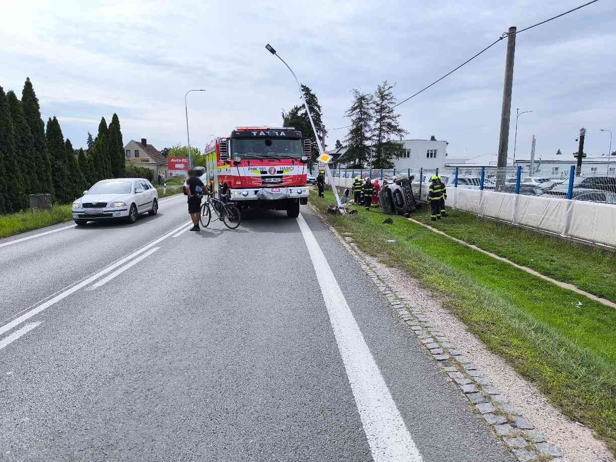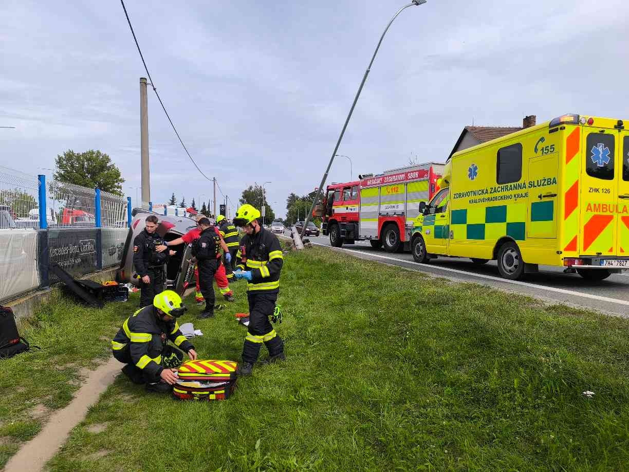 V sobotu 9. srpna 2025 krátce po 15:00 vyjížděly dvě jednotky hasičů z centrální stanice v Hradci Králové k dopravní nehodě v ulici Bratří Štefanů. Osobní automobil sjel z vozovky, narazil do sloupu veřejného osvětlení a převrátil se na bok u plotu autosalonu.