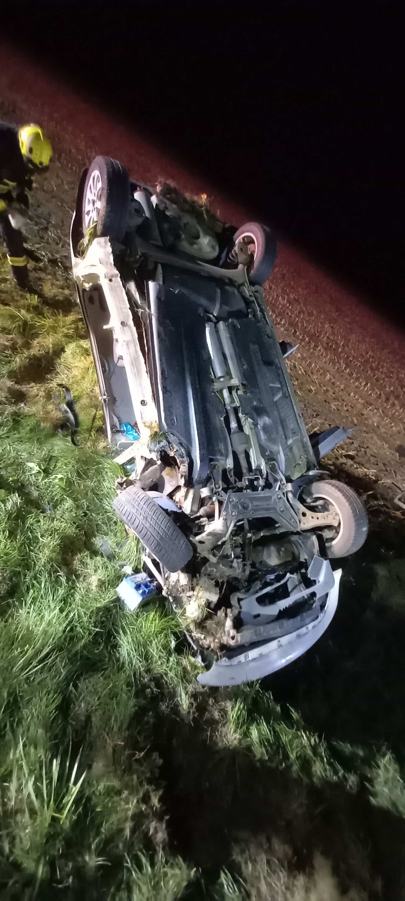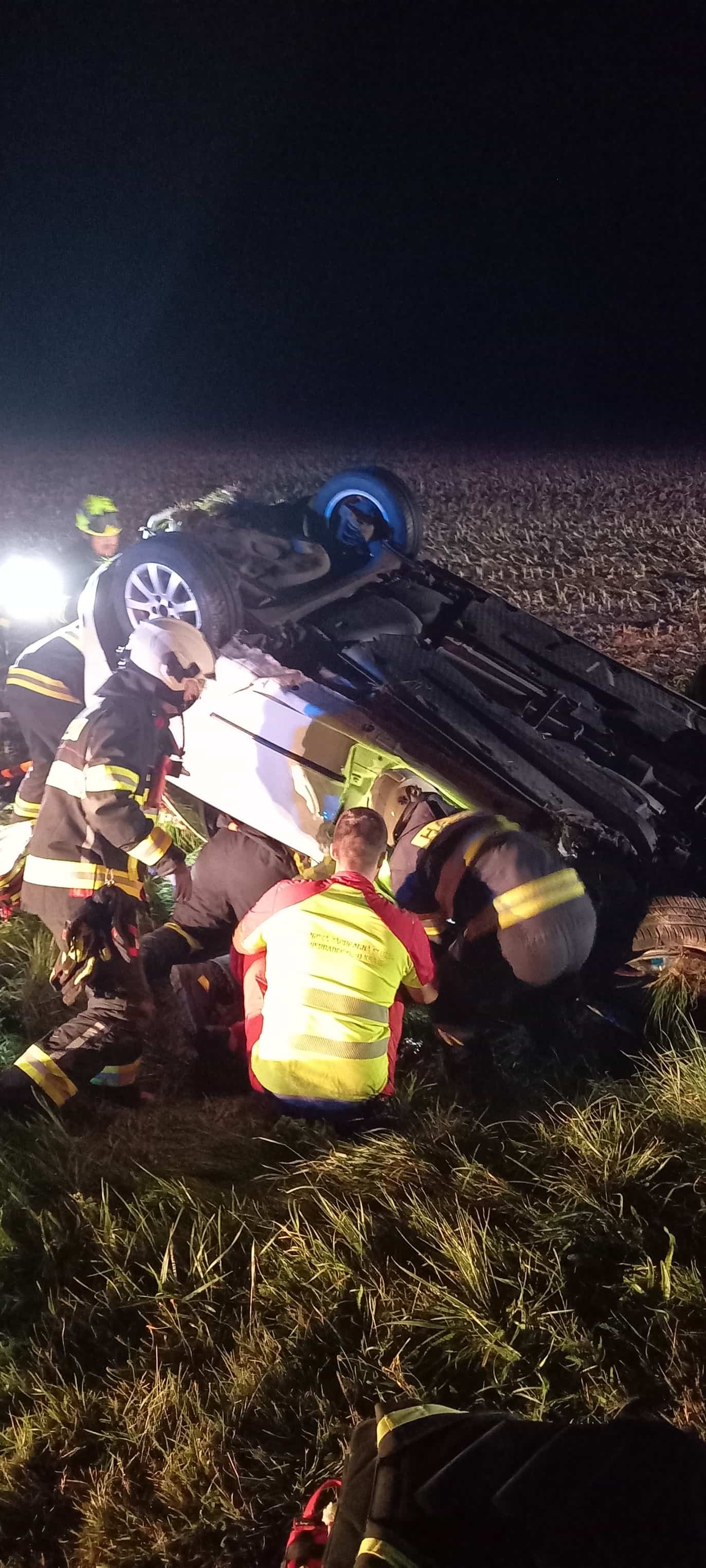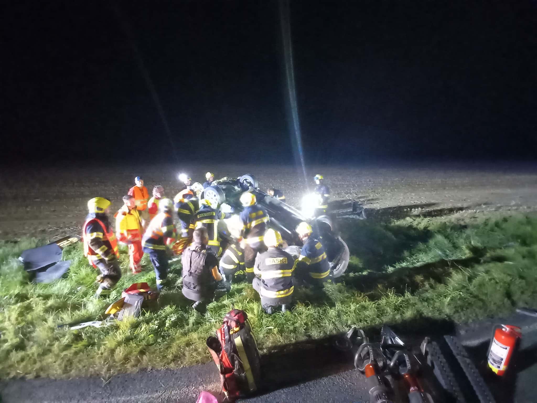 Osobní auto se převrátilo po střetu s kombajnem, posádku museli vyprošťovat hasiči