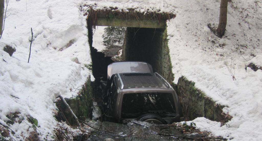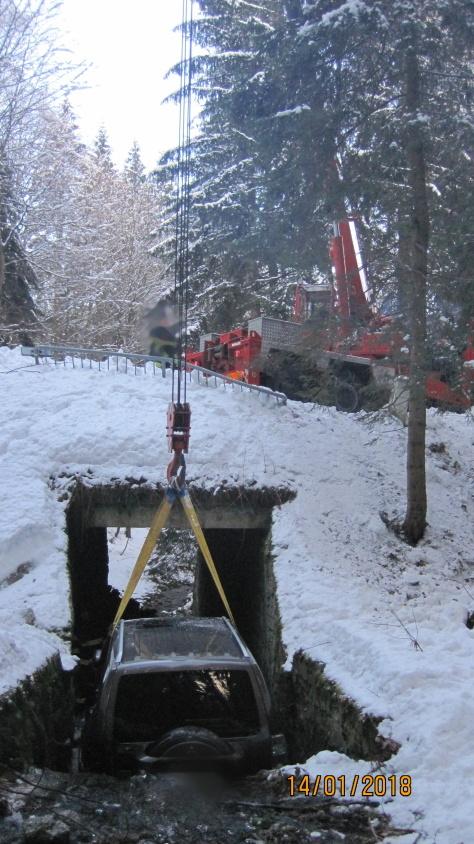 Osobní vozidlo u Deštného v Orlických horách v Luisině údolí spadlo do potoka a hasiči jej museli vyprošťovat pomocí jeřábu.